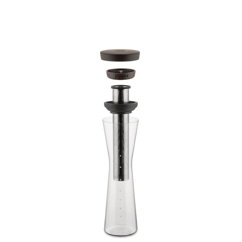 Karafka do kawy cold brew wykonana ze szkła, stali nierdzewnej, silikonu i żywicy termoplastycznej, brązowa. Filtr ze stali nierdzewnej 18/10. W wyniku wnikliwych badań nad sposobami przygotowywania kawy, Mazagran jest narzędziem do parzenia kawy na zimno, czyli metody która bez użycia gorącej wody pozwala uniknąć utleniania się kawy, pozwalając na napoj o intensywnym i pełnym smaku. Zaprojektowany z myślą o doskonałej ekstrakcji kawy, idealny do delektowania się świeżym i energetyzującym napojem. Ta metoda parzenia kawy wymaga dłuższego czasu 7/8 godzin ale ostateczny wynik otrzymanego napoju jest najwyższej jakości. Bardzo ciekawą cechą tego napoju jest to, że można przechowywać w lodówce do 3/4 dni i spożywać w razie ochoty. Dzbanek, pokrywkę, wewnętrzną nakrętkę i wspornik filtra należy myć ciepłą wodą z dodatkiem środka do mycia naczyń. Unikać gąbek i substancji ściernych. Dzbanek nie nadaje się do zmywarek. Osuszyć miękką szmatką. Filtr należy oczyścić pod bieżącą wodą, a jeśli mikroperforacje są zatkane, namoczyć na kilka minut w gorącej wodzie i płynie do mycia naczyń, a następnie spłukać dużą ilością wody. Pokrywkę, zatyczkę i wspornik filtra można myć w zmywarce, uważając, aby umieścić je w górnym koszu.