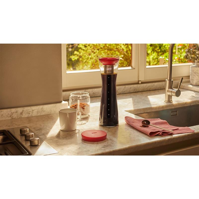Karafka do kawy cold brew ze szkła, stali nierdzewnej, silikonu i żywicy termoplastycznej, czerwona. Filtr ze stali nierdzewnej 18/10. W wyniku wnikliwych badań nad sposobami przygotowywania kawy, Mazagran jest narzędziem do parzenia kawy na zimno, czyli metody która bez użycia gorącej wody pozwala uniknąć utleniania się kawy, pozwalając na napoj o intensywnym i pełnym smaku. Zaprojektowany z myślą o doskonałej ekstrakcji kawy, idealny do delektowania się świeżym i energetyzującym napojem. Ta metoda parzenia kawy wymaga dłuższego czasu 7/8 godzin ale ostateczny wynik otrzymanego napoju jest z pewnością najwyższej jakości. Bardzo ciekawą cechą tego napoju jest to, że można przechowywać w lodówce do 3/4 dni i spożywać w razie ochoty. Dzbanek, pokrywkę, wewnętrzną nakrętkę i wspornik filtra należy myć ciepłą wodą z dodatkiem środka do mycia naczyń. Unikać gąbek i substancji ściernych. Dzbanek nie nadaje się do zmywarek. Osuszyć miękką szmatką. Filtr należy oczyścić pod bieżącą wodą, a jeśli mikroperforacje są zatkane, namoczyć na kilka minut w gorącej wodzie i płynie do mycia naczyń, a następnie spłukać dużą ilością wody. Pokrywkę, zatyczkę i wspornik filtra można myć w zmywarce, uważając, aby umieścić je w górnym koszu.