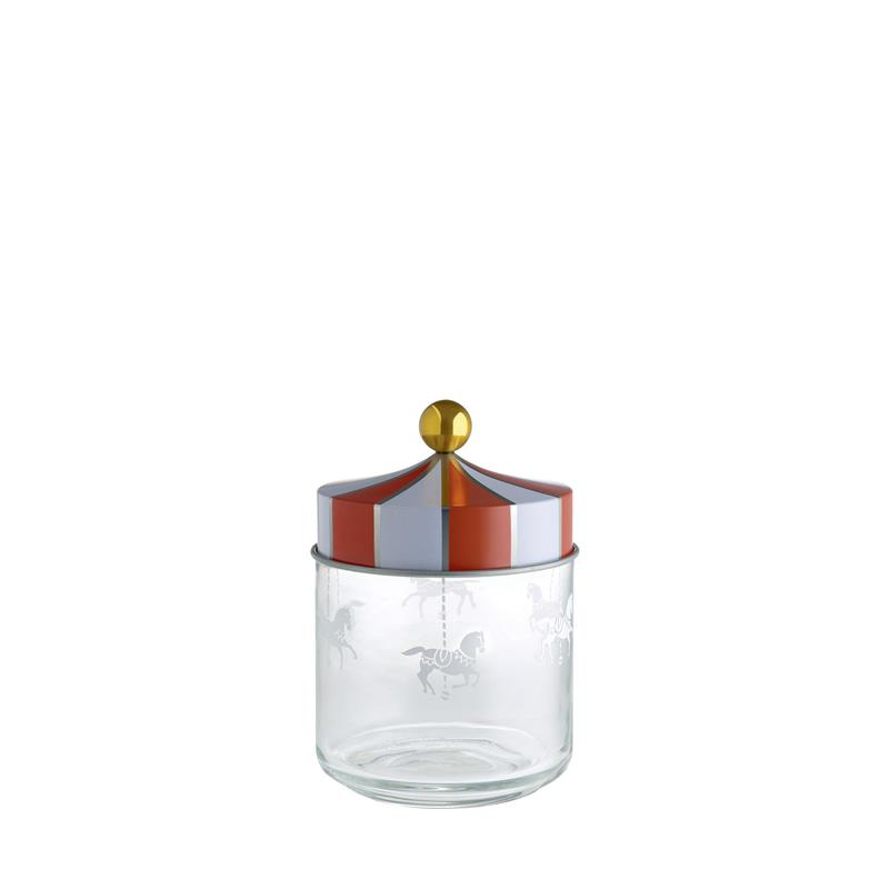 dekoracyjna forma pokrywki oraz wzór naniesiony na szklany pojemnik metodą sitoruku nawiązują do estetyki cyrkowego namiotu