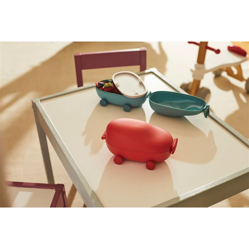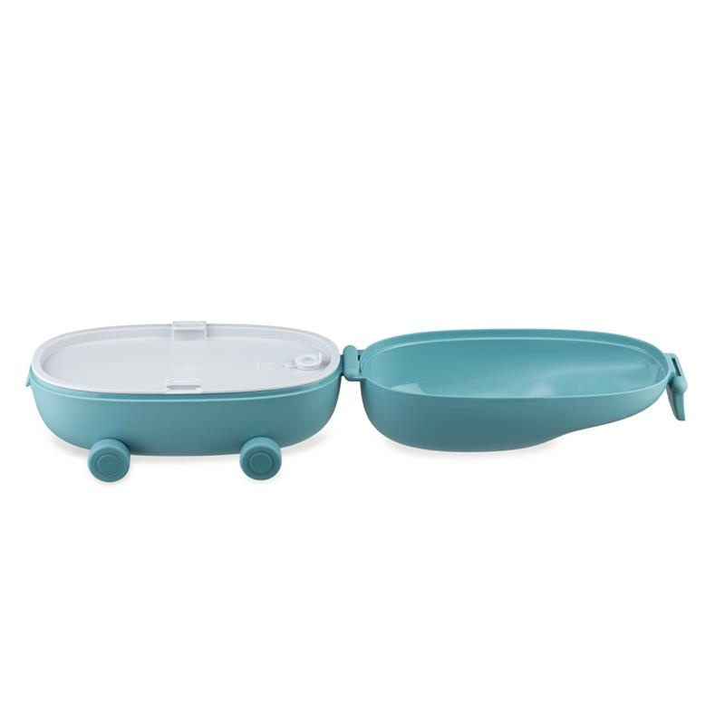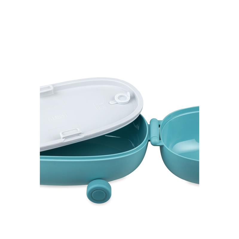 Dwukomorowe pudełko na przekąski z termoplastycznej żywicy, jasnoniebieskie. Sakura Adachi rozszerza kolorowy świat fantasy rodziny Food ? porter o nowe, zabawne pudełko na przekąski dla dzieci. Pojemnik na przekąskę w kształcie autka, dzięki czemu czas na przekąskę jest zawsze okazją do dobrej zabawy. Niezależnie od tego, czy są to poranne przerwy w szkole, czy po szkole przed oczekiwaniem na kolację, dzieci często są głodne i muszą spożywać szybkie przekąski między posiłkami. Z pudełkiem na przekąski Food ? Porter mogą przynieść z domu świeże i zdrowe jedzenie. Krojone owoce i warzywa, krakersy, kanapki, sery ... itp. można łatwo zapakować w pudełko z przekąskami do spożycia w szkole, na ławce w parku, w sali gimnastycznej, a nawet w samochodzie w drodze na zajęcia sportowe po lekcjach. Z pojemnikiem na lunch Food ? Porter, z wewnętrzną pokrywką, przekąski można podzielić na dwie przegródki.W przeciwnym razie, bez wewnętrznej pokrywy, w pojemniku można przechowywać dość obszerne produkty, takie jak babeczki, kanapki lub jogurt w kubku. Pudełko z przekąskami jest wyposażone w cztery małe kółka. Jego unikalna cecha sprawia, że pudełko z przekąskami mieści się gdzieś pomiędzy pojemnikiem na żywność a zabawką do zabawy. Przyjazna forma może jednocześnie zaprosić dzieci do jedzenia, zabawy i zabawy. Pudełko składa się z dwóch oddzielnych przegródek o pojemności odpowiednio 350 i 250 ml. Dwa pojemniki są oddzielone wyjmowanym elementem z odpowietrznikiem wyposażonym w małą silikonową zatyczkę odpowietrzającą, którą można wyjąć w celu podgrzania żywności w kuchence mikrofalowej.