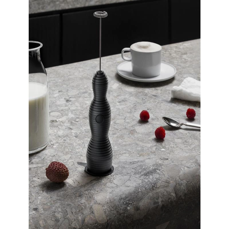 Spieniacz do mleka rozszerza udaną kolekcję Pulcina. Zaprojektowany przez Michele De Lucchi, jest zarówno łatwy w obsłudze, jak i funkcjonalny, w połączeniu z delikatną i uspokajającą geometrią, która podkreśli domowy krajobraz. Spieniacz dedykowany jest wszystkim miłośnikom designu, którzy nie mogą się oprzeć dobremu cappuccino przyrządzonemu w domu. I wszystkim miłośnikom cappuccino, którzy nie mogą się oprzeć dobremu designowi. Składa się z jednego elementu, którego nie można rozebrać. W skład zestawu wchodzi: korpus silnika ABS z przyciskiem on-off oraz portem USB-C do ładowania, zintegrowany spieniacz ze stali nierdzewnej, przewód zasilający. Urządzenie posiada europejskie certyfikaty REACH i RoHS. Rejestracja, ocena, udzielanie zezwoleń i stosowanych ograniczeń w zakresie chemikaliów to najsurowsze rozporządzenie wydane do tej pory przez Wspólnotę Europejską i dotyczy rejestracji, oceny, udzielania zezwoleń i ograniczania chemikaliów stosowanych w produkcie. Restriction of Hazardous Substances to zasada mająca na celu ograniczenie zawartości niektórych szkodliwych substancji w elementach elektronicznych oraz umożliwienie lepszej i bardziej efektywnej utylizacji. Korpus silnika należy czyścić tylko miękką wilgotną szmatką i dokładnie osuszyć. Nie używaj ściernych ściereczek ani detergentów, które mogłyby uszkodzić wykończenie przedmiotu. Spieniacz można opłukać pod bieżącą wodą lub zanurzyć w gorącej wodzie z mydłem i uruchomić na kilka sekund. Wysuszyć dokładnie. Nie myć w zmywarce. Spieniacz Wykonany jest z żywicy termoplastycznej. Stalowa trzepaczka i akumulator.