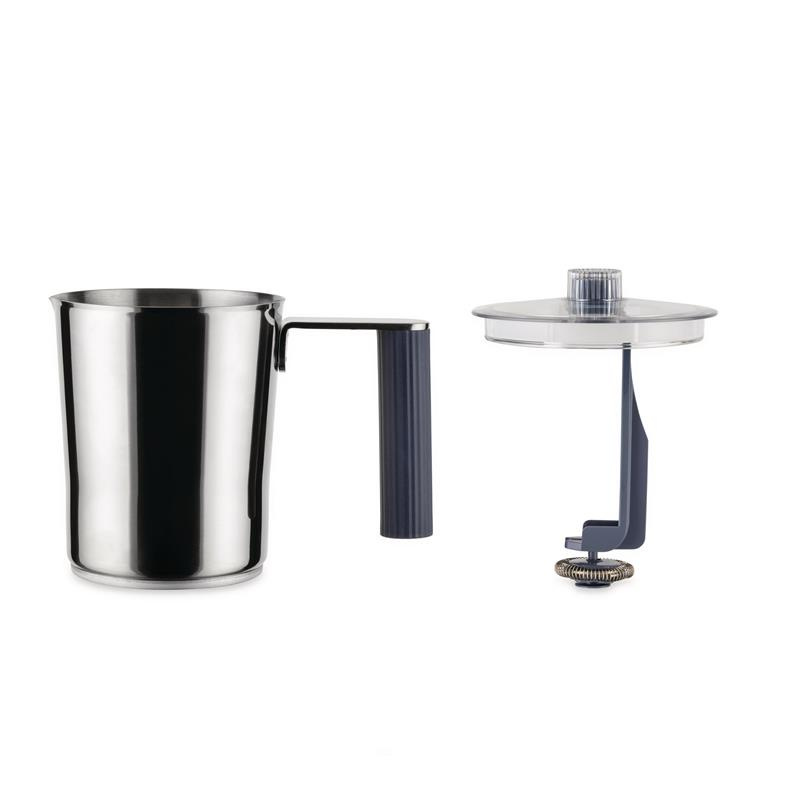 Wielofunkcyjny indukcyjny spieniacz do mleka z żywicy termoplastycznej, szary. Dzbanek ze stali nierdzewnej 18/10. Moc 600 W. Dla miłośników designu, którzy chcą zrobić w domu własne cappuccino lub gorącą czekoladę w stylu baristy. Zaawansowana technologicznie wydajność i urzekający design nowego małego urządzenia kuchennego, które dodaje się do kolekcji architekta zaprojektowanej dla Alessi. Spieniacz składa się z jednostki silnikowej obudowanej żywicą termoplastyczną, z wbudowanej podstawy grzewczej, wyposażony jest we wtyczkę, przełącznik START/STOP oraz pokrętło programatora. Uzupełnieniem jest dzbanek ze stali nierdzewnej z uchwytem z żywicy termoplastycznej, przezroczysta pokrywa z PCTG wyposażona w pokrętło i wewnętrzny wspornik spieniacza oraz metalowy spieniacz spiralny do spieniania płynów. Spieniacz posiada również cztery antypoślizgowe nóżki, które zapewniają stabilność podczas użytkowania. Dzbanek ze stali nierdzewnej wewnątrz ma oznaczenia wskazujące maksymalny i minimalny poziom napełnienia dla czterech różnych programów: gorące mleko, gorące spienione mleko, zimne spienione mleko i gorąca czekolada. Sposób użycia: Postaw dzbanek na stabilnej powierzchni, zdejmij pokrywkę i wlej żądaną ilość mleka, przestrzegając maksymalnego i minimalnego poziomu napełnienia. Załóż z powrotem pokrywkę na dzbanek, umieść dzbanek na podstawie grzewczej i podłącz. Wybierz żądaną funkcję i naciśnij Start. Po zakończeniu cyklu ekspres do cappuccino wyłączy się automatycznie. Dzbanek ze stali nierdzewnej z uchwytem, pokrywkę i spiralny element spieniacza można myć w zmywarce, natomiast podstawę grzewczą należy przetrzeć wilgotną ściereczką, a następnie wysuszyć.