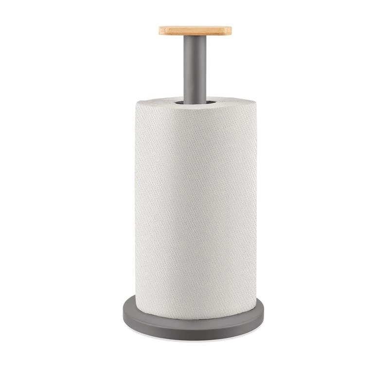 Uchwyt na papier kuchenny ze stali pokrytej żywicą epoksydową w kolorze ciemnoszarym. Gałka wykonana z drewna bambusowego. Kolorowy i zajmujący niewiele miejsca uchwyt kuchenny Mattina ma minimalistyczny design, który zawiera szereg detali zaprojektowanych w celu zwiększenia jego funkcjonalności. Nieodzowny dodatek w każdej kuchni. Uchwyt na papierowe ręczniki zaczął pojawiać się również na naszych stołach, stanowiąc doskonałą alternatywę dla papierowych serwet, często cieńszych i mniej wytrzymałych niż ręczniki papierowe.