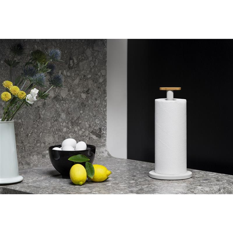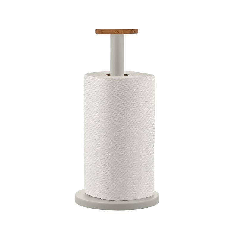 Uchwyt na papier kuchenny ze stali pokrytej żywicą epoksydową w kolorze szarym. Gałka wykonana z drewna bambusowego. Kolorowy i zajmujący niewiele miejsca uchwyt kuchenny Mattina ma minimalistyczny design, który zawiera szereg detali zaprojektowanych w celu zwiększenia jego funkcjonalności. Nieodzowny dodatek w każdej kuchni. Uchwyt na papierowe ręczniki zaczął pojawiać się również na naszych stołach, stanowiąc doskonałą alternatywę dla papierowych serwet, często cieńszych i mniej wytrzymałych niż ręczniki papierowe.
