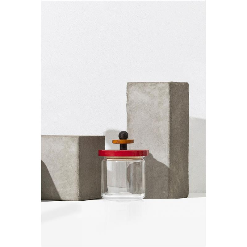 Szklany słoik z hermetyczną pokrywką wykonaną z drewna bukowego w kolorach- czerwonym, czarnym i żółtym.