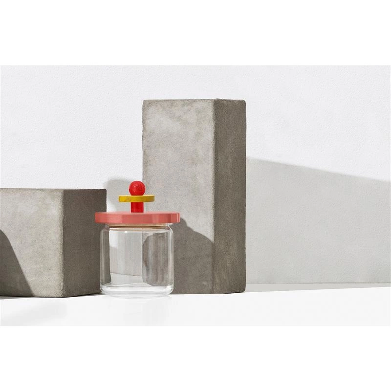 Szklany słoik z hermetyczną pokrywką wykonaną z drewna bukowego w kolorach- różowym, czeronym i żółtym.