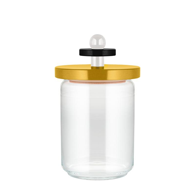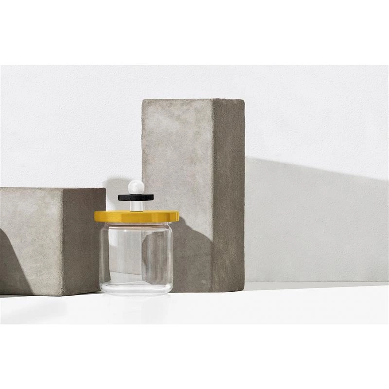 Szklany słoik z hermetyczną pokrywką wykonaną z drewna bukowego w kolorach- żółtym, czarnym i białym.
