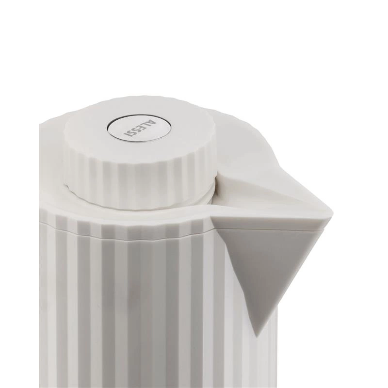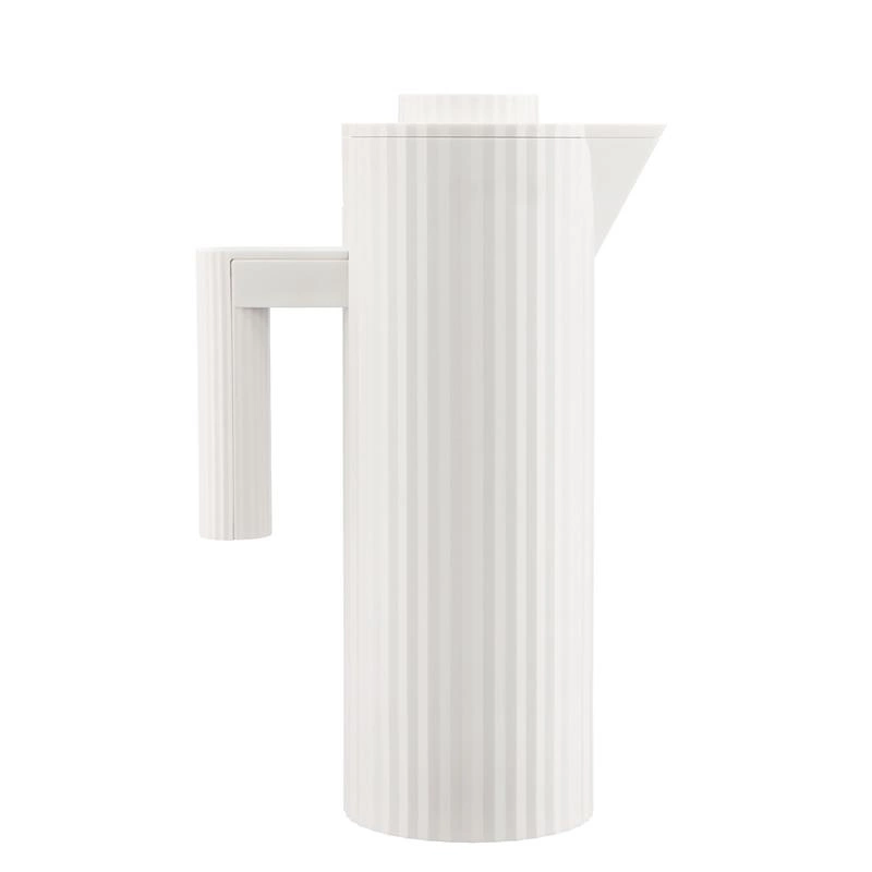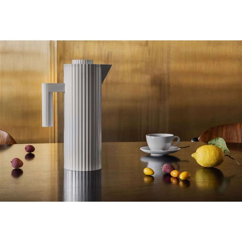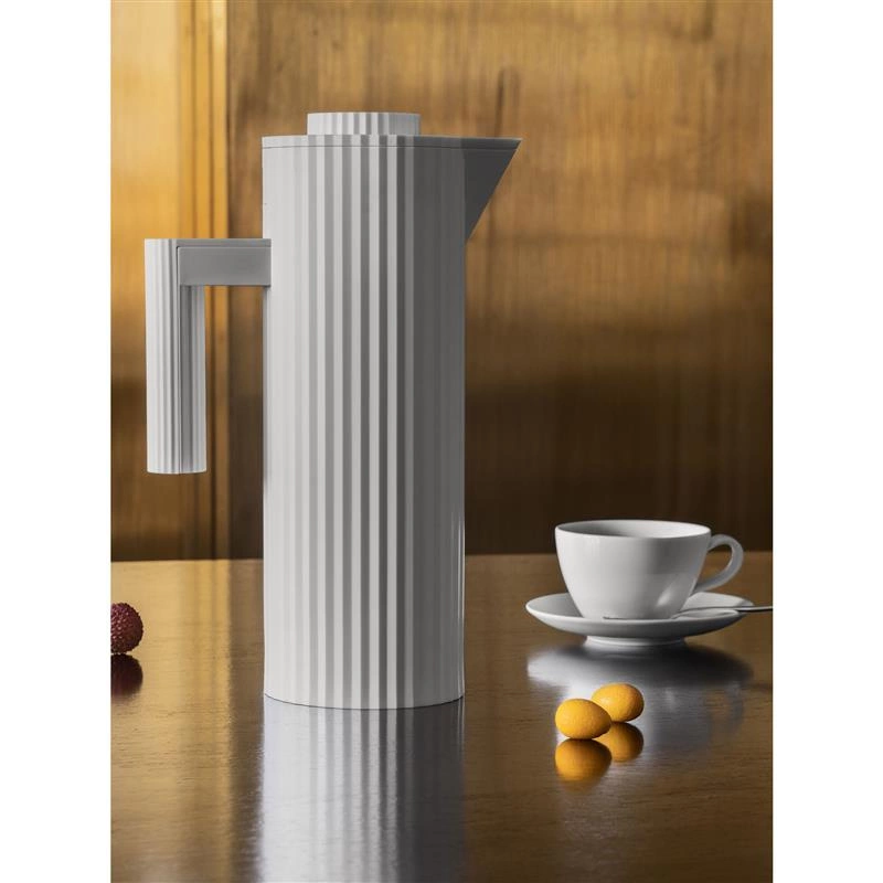 Termos wykonany z żywicy termoplastycznej, biały. Wewnątrz dwuścienne szkło termiczne. Wyrafinowana draperia ubiera ten termoizolacyjny dzbanek zaprojektowany przez Michele De Lucchi: zwięzłe geometryczne linie i uważna kompozycja elementów, łącząca w obiekcie wymagania techniczne- wysoką wydajność i elegancję krawiectwa. Lekki i łatwy w użyciu termos Plisse jest praktyczny, łącząc to z kultowym i ponadczasowym kształtem. Termos składa się z korpusu z nakrętką z termoplastycznej żywicy i wewnętrznego, dwuściennego pojemnika ze szkła termicznego. Nakrętka posiada przycisk ze stali nierdzewnej do otwierania/zamykania dozowania napoju. Na korpusie, nad uchwytem, znajduje się zagłębiony przycisk, który otwiera górną część dzbanka i umożliwia wyjęcie wewnętrznego pojemnika. Ciepłe napoje utrzymają swą temperaturę do 12 godz natomiast zimne do 24 godz. Nie zanurzać dzbanka w wodzie. Z zewnątrz wyczyścić wilgotną ściereczką, nie używać agresywnego detergentu. Nie myć dzbanka w zmywarce.