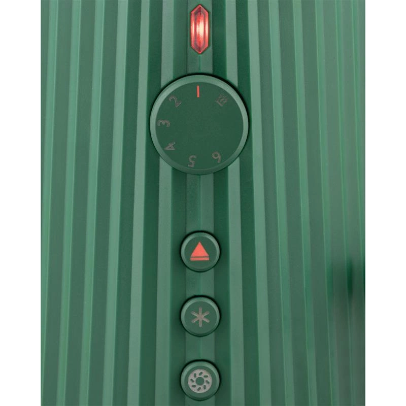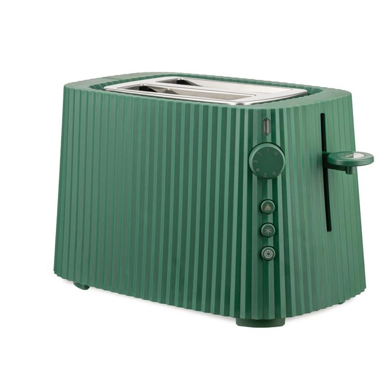 Toster wykonany z żywicy termoplastycznej, zielony. Moc 850 W. Dzięki eleganckiej formie, jednolitym kolorom i niepowtarzalnym powierzchniom, które naśladują efekt lekko plisowanej tkaniny, toster Plissé zamienia codzienny rytuał śniadania w coś wyjątkowego. Idealny na brunche i aperitify, zarówno w domu jak i w biurze, aby podzielić się odrobiną smaku w wielkim stylu. Składa się z korpusu z kontrolką zasilania, pokrętła regulacji opiekania (6 poziomów), dźwigni podnoszenia, przycisków ANULUJ, ROZMRAŻANIA i BAJGLA oraz tacki na okruchy. Funkcje: 6 poziomów zrumienienia można łatwo ustawić za pomocą odpowiedniego pokrętła. - Funkcja podgrzewania umożliwia przywrócenie chleba do wymaganej temperatury w ciągu 30 sekund. - Funkcja rozmrażania umożliwia rozmrożenie chleba przed rozpoczęciem opiekania. - Funkcja BAJGEL umożliwia opiekanie tylko jednej strony chleba. - Funkcja stop automatycznie wysuwa szczypce z chlebem.