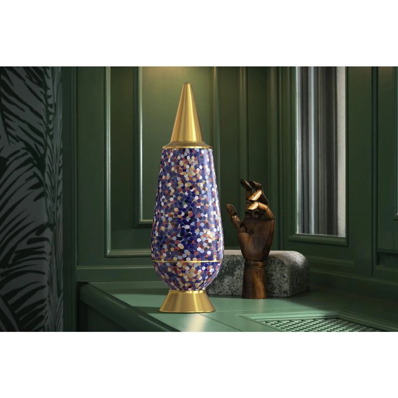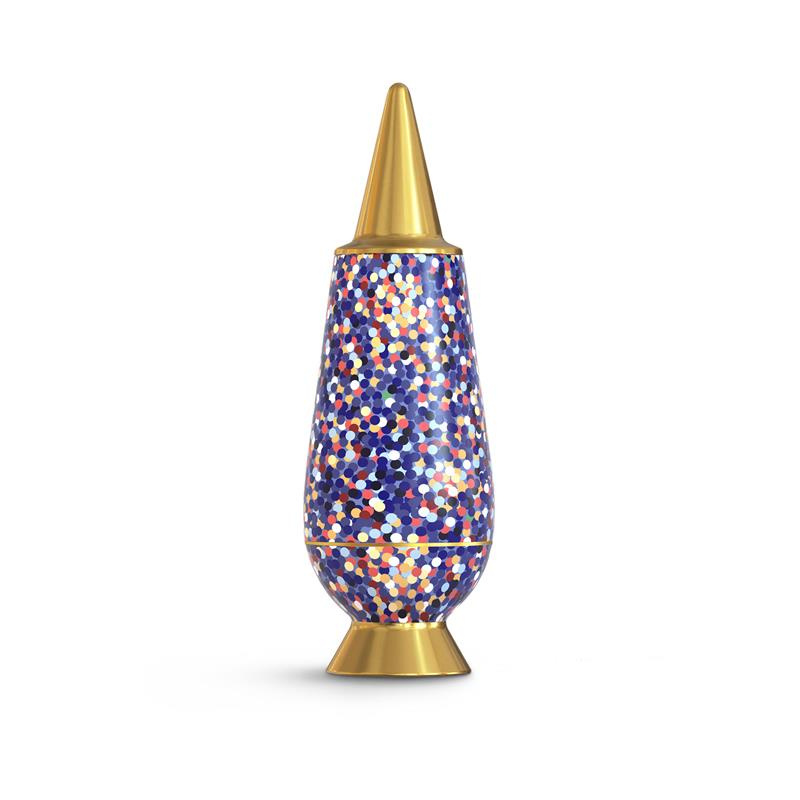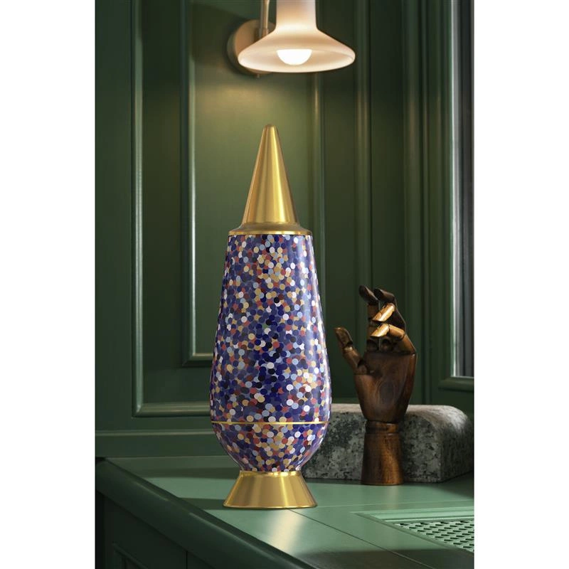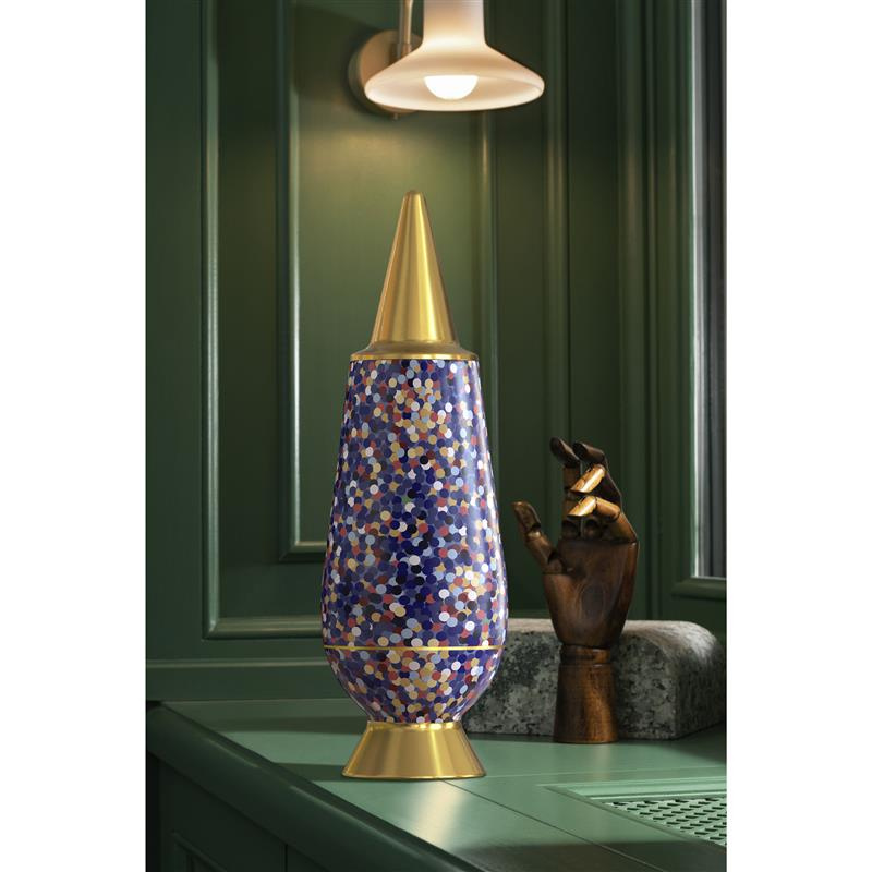 Wazon z pokrywką z dekorowanej porcelany i złota. Wykonany w limitowanej edycji 999 egzemplarzy. Wazon Proust Alessandro Mendiniego to przedmiot, który wyznacza granicę między sztuką a designem, dedykowany kolekcjonerom z pasją do wyjątkowych przedmiotów. Cenny przedmiot- wieko i podstawa są ozdobione ręcznie nakładanym czystym złotem, co daje nam niezwykłą interpretację słynnej dekoracji inspirowanej znanym pisarzem Marcelem Proustem i paryskimi pointylistami. Wyskość: 40 cm