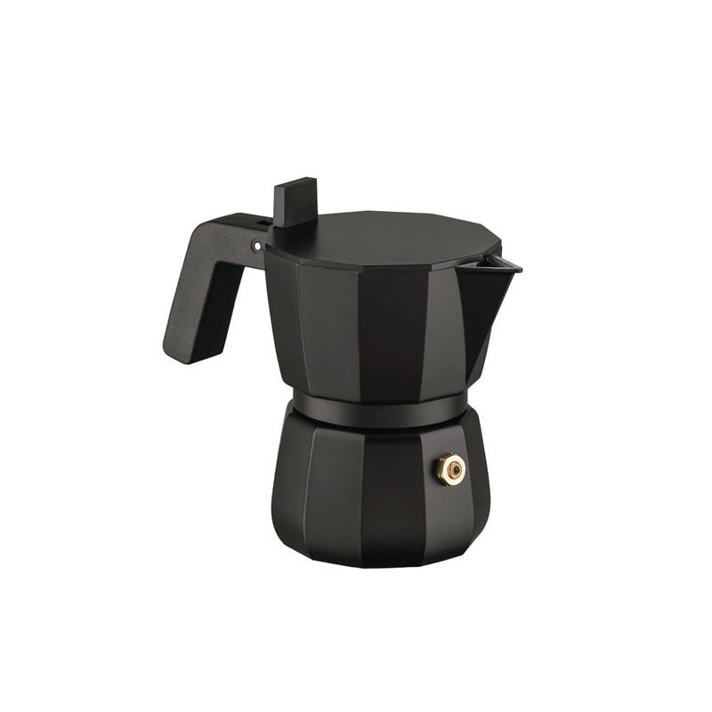 Ekspres do kawy espresso z odlewu aluminiowego, czarny. Uchwyt i gałka PA w kolorze czarnym. Zawór mosiężny. Nowa czarna kolorystyka podkreśla formalny wygląd Moki, czyniąc z niej jeszcze bardziej wyrafinowany przedmiot: można go potraktować jako minimalistyczny dodatek na kuchence.