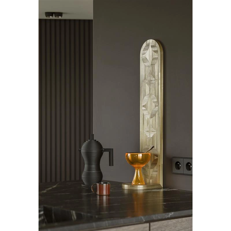 Ekspres do kawy espresso wykonany z aluminiowego odlewu, czarny. Uchwyt i gałka z PA, czarne. Zaparzacz Pulcina, zaprojektowany przez Michele de Lucchi dzięki wewnętrznemu kształtowi specjalnego podgrzewacza, automatycznie przestaje filtrować kawę w odpowiednim momencie. Ten odpowiedni moment pomaga wyeliminować ostatni etap filtrowania, który generuje przypalony i gorzki posmak, zapewniając zachowanie tylko najlepszych właściwości kawy i wzmacniając jej pełny aromat. Kształt wylewki „V”, przypominający dziób pisklęcia, jest specjalnie zaprojektowany, aby idealnie ciąć krople podczas nalewania bez kapania. Zaparzacz nie jest przystosowany do mycia w zmywarce. Należy myć gorącą bieżącą wodą i nieścierną ściereczką. Konserwacja: okresowe czyszczenie górnego mikrofiltra; w razie uszkodzenia wymienić uchwyt, pokrętło, lejek, górny mikrofiltr i uszczelkę z gumy silikonowej. Nie nadaje się do płyt indukcyjnych.