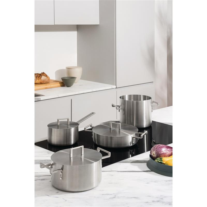 Zestaw garnków wykonanych z trójwarstwowych stopów- AISI 430, aluminium, stal nierdzewna 18/10, z satynowym wykończeniem. Rękojeści wykonano ze stali nierdzewnej 18/10 z powłoką PVD. Dno ze stali magnetycznej. Trójwarstwowy materiał- wewnętrzna warstwa stali utrzymuje stałą temperaturę, warstwa aluminium zapewnia równomierne rozprowadzanie ciepła, a zewnętrzna warstwa stali nierdzewnej sprawia, że jest on niezwykle trwały. Garnki nadają się do gotowania na płytach indukcyjnych, gazowych, ceramicznych, płytach elektrycznych oraz z lampami halogenowymi. Seria Convivio nadaje się do mycia w zmywarce. Zalecane jest stosowanie delikatnych detergentów i ekonomicznych programów w niskiej temperaturze oraz suszenie ich zaraz po zakończeniu cyklu mycia. Convivio to owoc dialogu pomiędzy zdobywcą nagrody Pritzkera Davidem Chipperfieldem a nagrodzonym gwiazdką Michelin szefem kuchni Pietro Leemannem, których różne umiejętności połączyły się w koncepcji tej kolekcji. Garnki, patelnie i przybory kuchenne opracowane w celu stworzenia wszechstronnego, wydajnego zestawu, który będzie towarzyszył potrawom od przygotowania po podania na stole. Badając możliwości kuchni wegetariańskiej, przeanalizowano różne produkty, dokonując najlepszych wyborów technicznych, wymiarowych i typologicznych, dzięki czemu Convivio stało się zarówno uniwersalne, jak i szczególnie odpowiednie do gotowania warzyw i roślin strączkowych. Nazwa Convivio oddaje hołd gotowaniu jako czynności, która jest zarówno estetyczna, jak i przyjemna, zdolna do tworzenia wspólnoty poprzez gromadzenie ludzi wokół przygotowywania i cieszenia się jedzeniem. Podejście projektanta do projektu widoczne jest w skupieniu się na materiale, jego prostocie i czystości wzmocnionej wyrafinowanym zestawieniem tekstur i powierzchni.