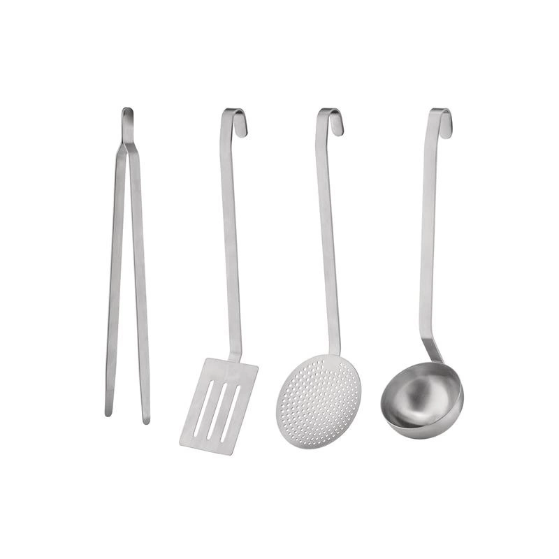 Zestaw przyborów kuchennych składający się z chochli, szpatułki, szczypiec i skimmera ze stali nierdzewnej 18/10, mat.
