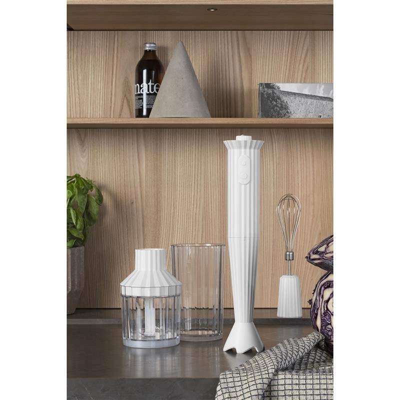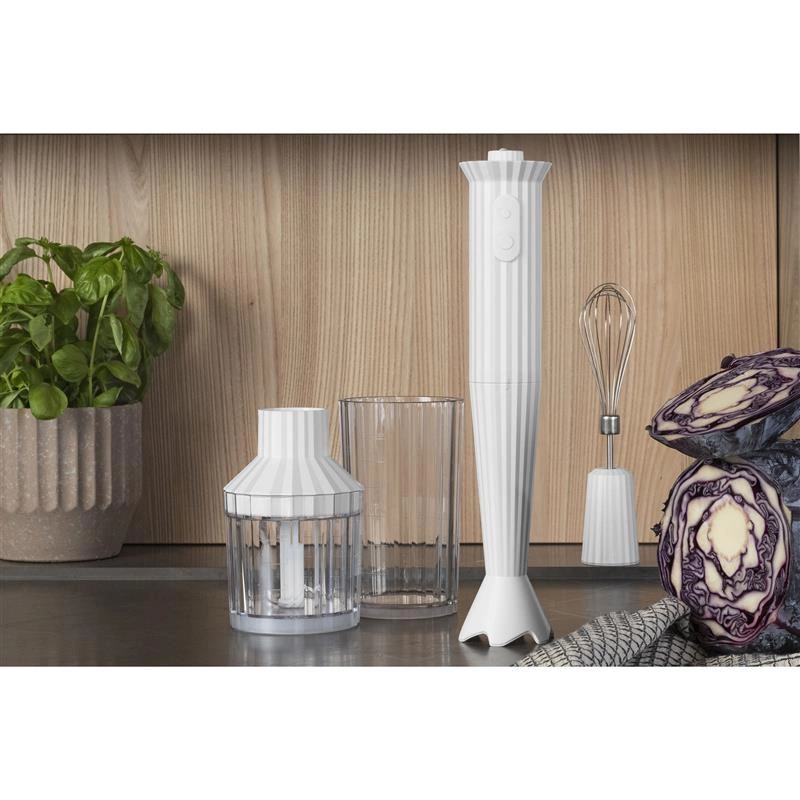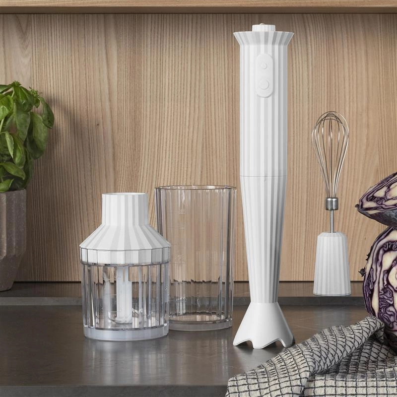 Alessi - zestaw z blenderem, biały Plisse Alessi - zestaw z blenderem, biały Plisse Zestaw skłądający się z blendera ręcznego, trzepaczki, siekacza oraz pojemnika z miarką, biały.