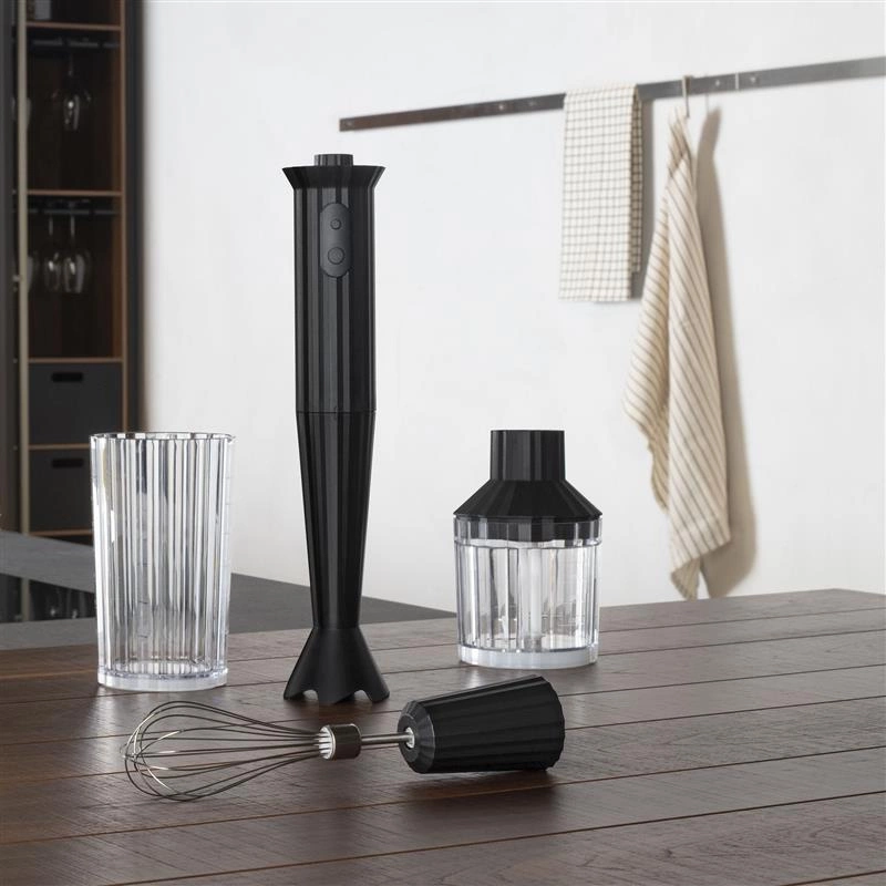 Zestaw skłądający się z blendera ręcznego, trzepaczki, siekacza oraz pojemnika z miarką, czarny. Moc: 500 W
