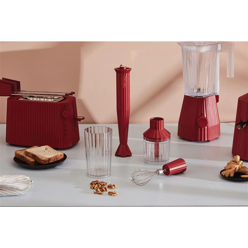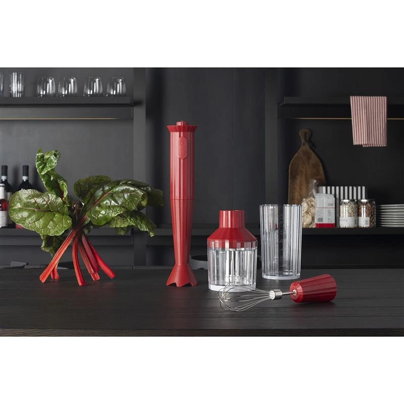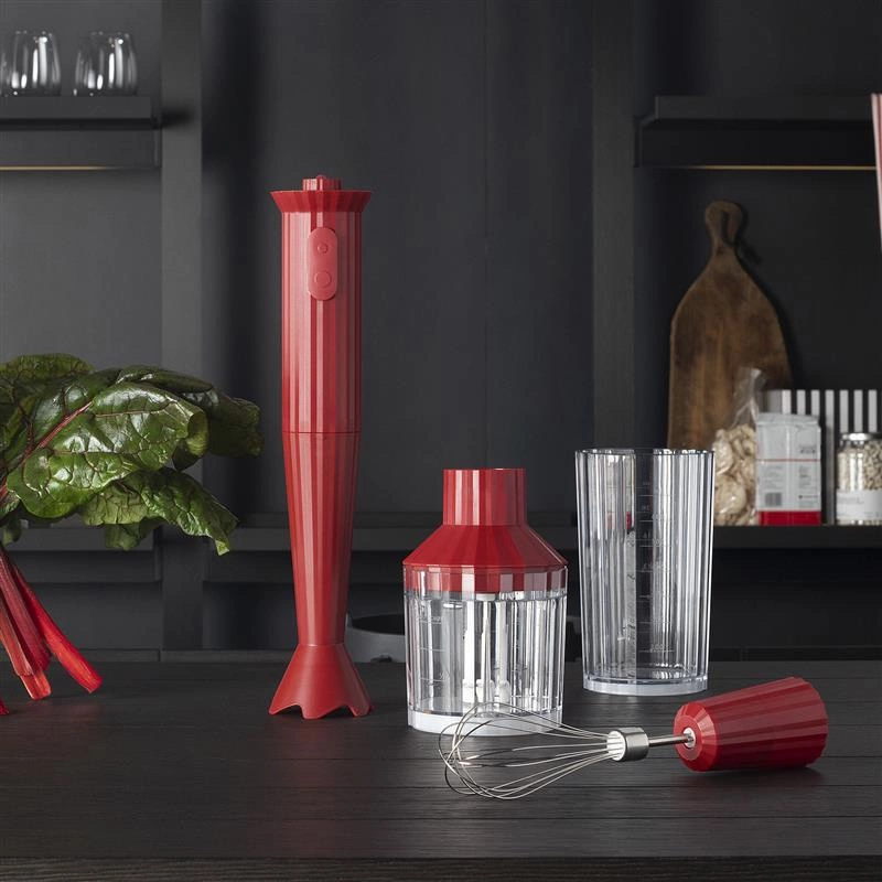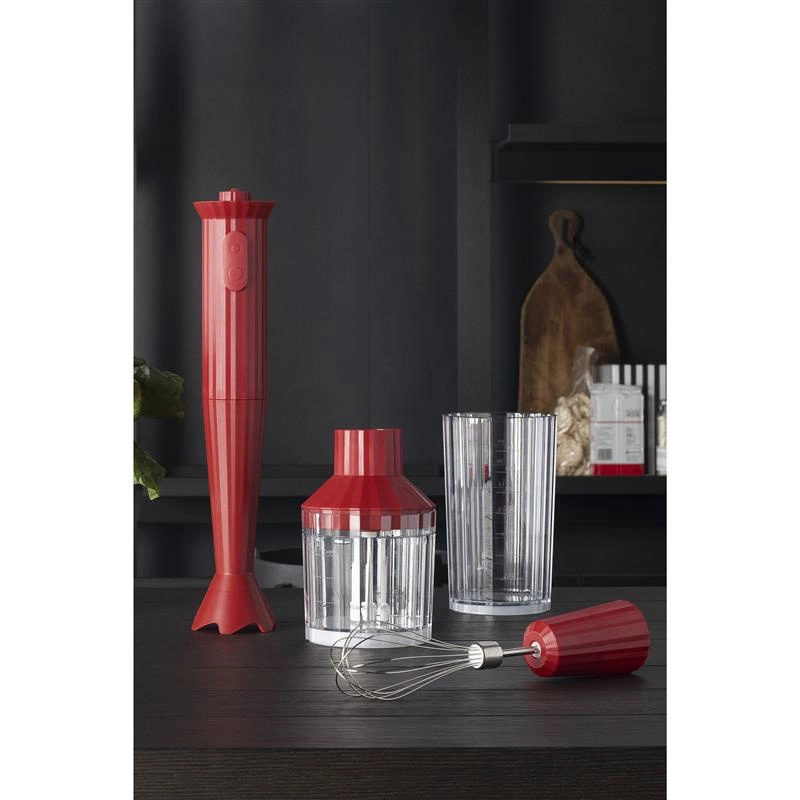 Zestaw skłądający się z blendera ręcznego, trzepaczki, siekacza oraz pojemnika z miarką, czerwony. Moc: 500 W