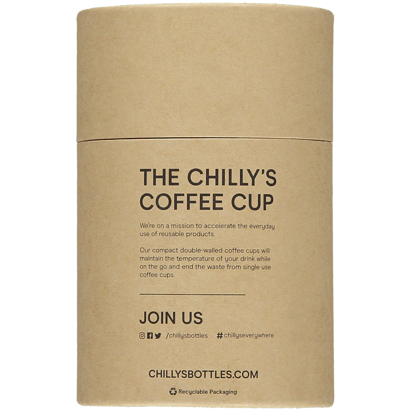 Ciesz się pyszną, świeżą kawą w każdym miejscu. Nasze kubki wielorazowego użytku to nie tylko dbałość o środowisko, ale także świetny design i użyteczność. Nasze kubki zostały wykonane ze stali typu 304, która nie zmienia smaku napoju i jest wolna od BPA. Dzięki technologii podwójnej ściany, która doskonale izoluje ciepło nie musisz się obawiać czy trzymając kubek z gorącą kawą poparzysz palce. Każdy produkt Chilly's jest zapakowany w piękny, ekologiczny karton co sprawia, że będzie to idealny pomysł na prezent. Produkt nie jest przeznaczony do mycia w zmywarce. Produktu nie wolno wkładać do lodówki czy mikrofalówki. Kubek z racji posiadania ustnika i odpowietrzacza nie jest w 100% zabezpieczony przed rozlewaniem się płynów, dlatego należy zachować ostrożność pijąc gorące napoje.