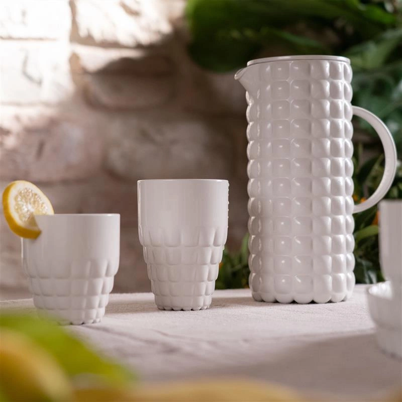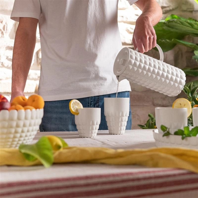 Dzbanek Tiffany jest wykonany z wysokiej jakości przezroczystego plastiku z błyszczącymi efektami kolorystycznymi, dzięki czemu idealnie nadaje się do posiłku na świeżym powietrzu, ale także dodaje wyrafinowanego akcentu najbardziej formalnym zastawom stołowym. Wyprodukowany we Włoszech.
