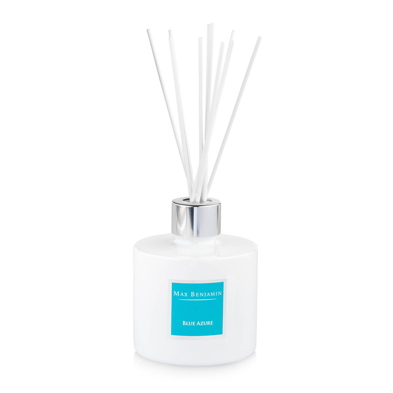 Dyfuzory zapachowe Max Benjamin są ręcznie produkowane w Hrabstwie Wicklow w Irlandii. Niezwykle aromatyczna mieszanka najwyższej jakości olejków zapachowych została zamknięta w pięknym porcelanowym pojemniku i zapakowana w eleganckie pudełko. Twój ulubiony zapach będzie uwalniał się przez okres nawet 4 miesięcy – siłę zapachu możesz dowolnie regulować ilością umieszczanych w pojemniku patyczków. Aby w pełni cieszyć się swoim ulubionym zapachem wystarczy od czas do czasu wyjąć patyczki z pojemnika i obrócić je góra-dół. Dyfuzor zapachowy Max Benjamin nie zawiera alkoholu, a każda mieszanka zapachów jest budowana w trosce o alergików, dlatego nasze produkty mają bardzo niski poziom alergenów. Zapach Blue Azure powstał jako wariacja na temat Morza Śródziemnego, nieba i powietrza przepełnionego cytrusowym aromatem, ten orzeźwiający zapach jest nasycony ziołami, przyprawami i delikatną nutą drewna.