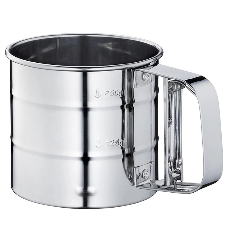 Kubek z sitkiem do przesiewania mąki, cukru etc., marki Kuchenprofi. Kubek wykonany w całości ze stali nierdzewnej.
