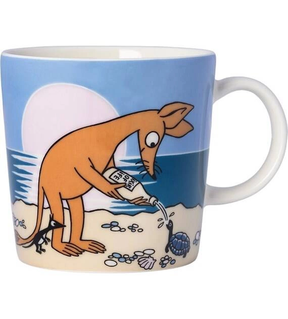Kubek Arabia Finland Muminki Ryjek (nowa wersja w kolorze niebieskim) fińskiej marki Arabia z serii porcelany poświęconej postaciom z książek Tove Jansson. Autorka znanych i lubianych książek o Muminkach zaakceptowała pierwsze grafiki podczas powstawania muminkowej porcelany.