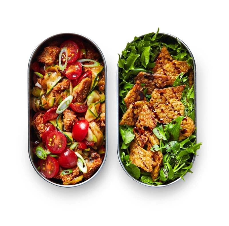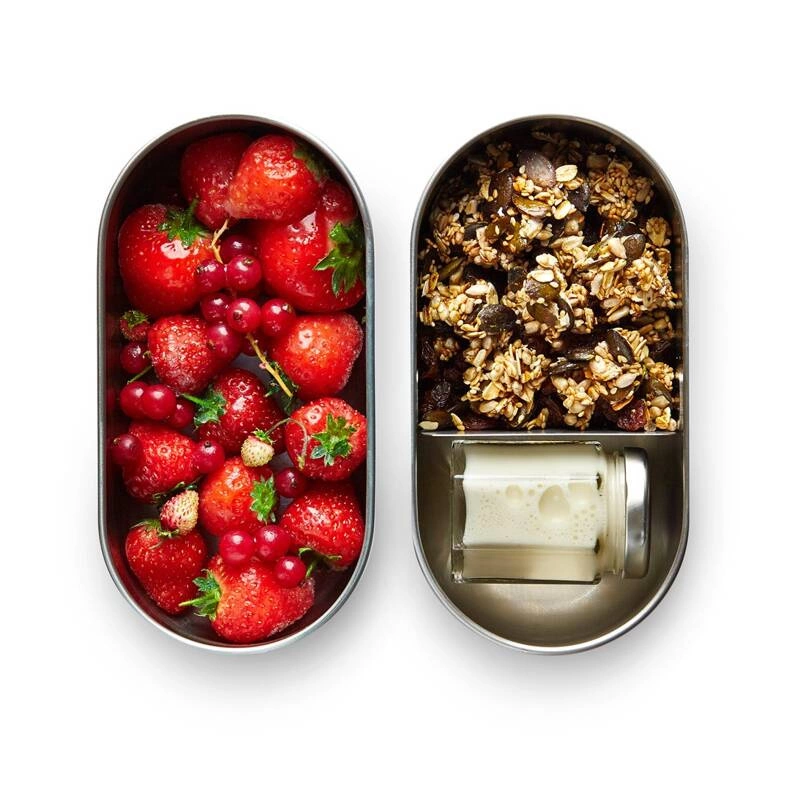 - elementy kompletu: 2 stalowe lunchboxy, stalowy widelec, 2 przykrywki wewnętrzne (polipropylen + włókno drzewne), bambusowa pokrywka-deseczka do krojenia, wewnątrz stalowy, ruchomy separator, elastyczna opaska spinająca,