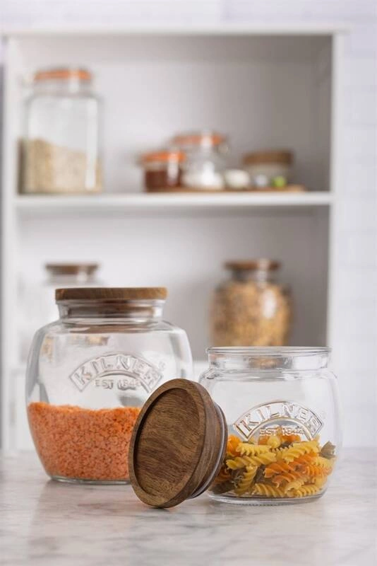 Słoik 2 l z drewnianą pokrywką Kilner: - pokrywka typu push-top wykonana z drewna akacji, - słoik ma pojemność 2 l, - jest idealny na produkty sypkie, - słoik można myć w zmywarce.