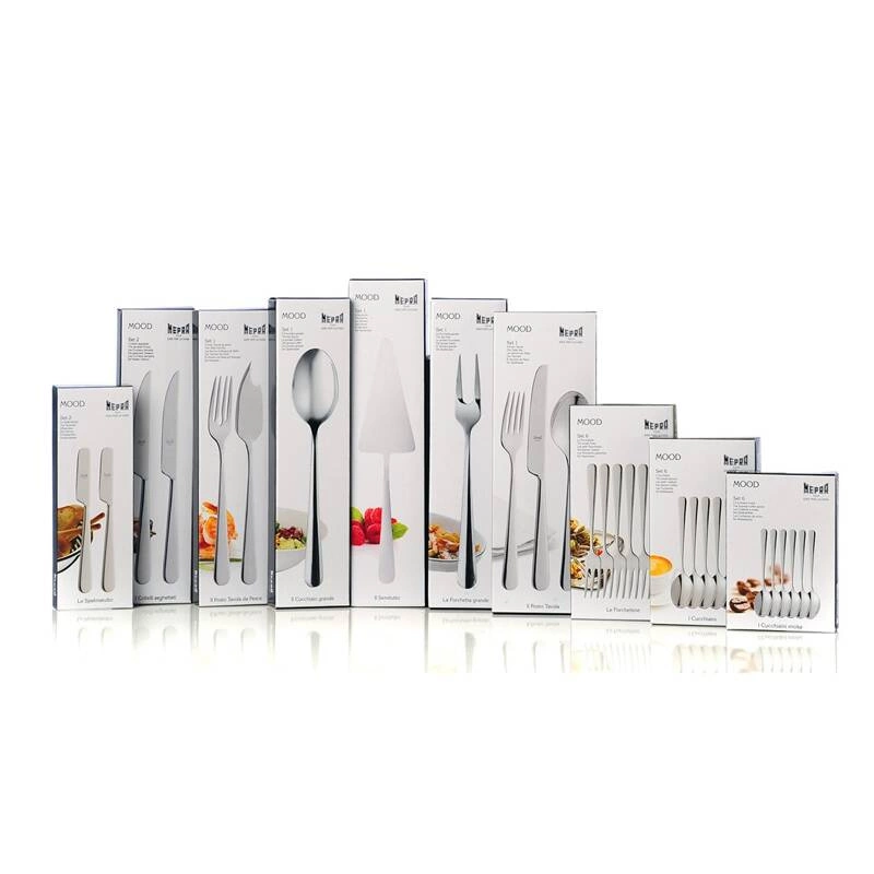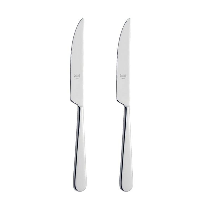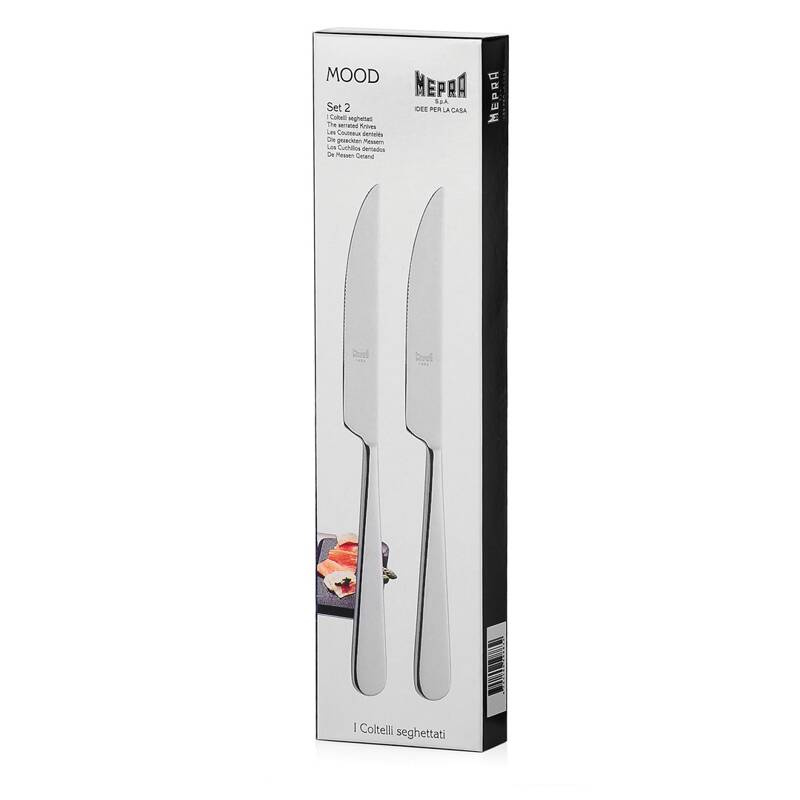 Zestaw 2 noży do steków Mood Mepra: - narzędzia posiadają ząbki, - są wykonane ze stali nierdzewnej, - mają klasyczny kształt pasujący do wielu naczyń, - posiadają pudełko, - można myć je w zmywarce.