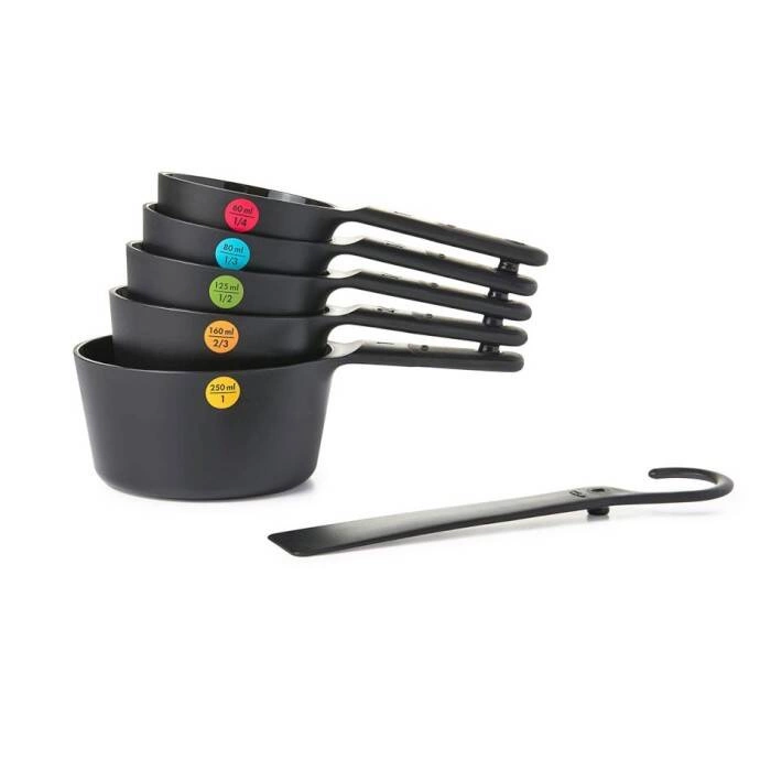 Zestaw miarek kuchennych z kolekcji Good Grips marki OXO, - w skład kompletu wchodzi 5 miarek: 60 ml, 80 ml, 125 ml, 160 ml, 250 ml oraz skrobak, - naczynia są w kolorze czarnym, - łatwe w przechowywaniu, nie zajmują dużo miejsca w kuchni, - nadają się do mycia w zmywarce.