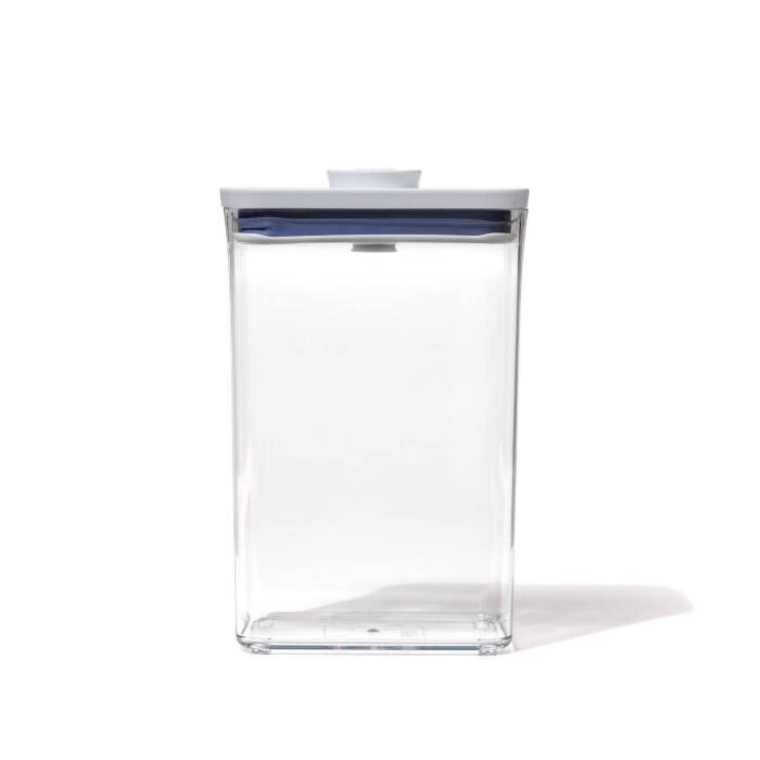 Pojemnik POP2 z kolekcji Good Grips marki OXO, - duża pojemność, do 2,6l., - doskonały na ciastka, przekąski, płatki i sypką żywność, - o prostokątnej podstawie, - wygodne przesypywanie dzięki wygodnemu przyciskowi, - można go myć w zmywarce.