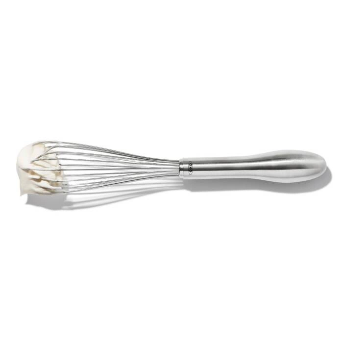 Trzepaczka marki OXO, - wykonana ze stali nierdzewnej, - posiada wygodny uchwyt, - doskonale sprawdza się do mieszania i ubijania składników, - można ją myć w zmywarce.