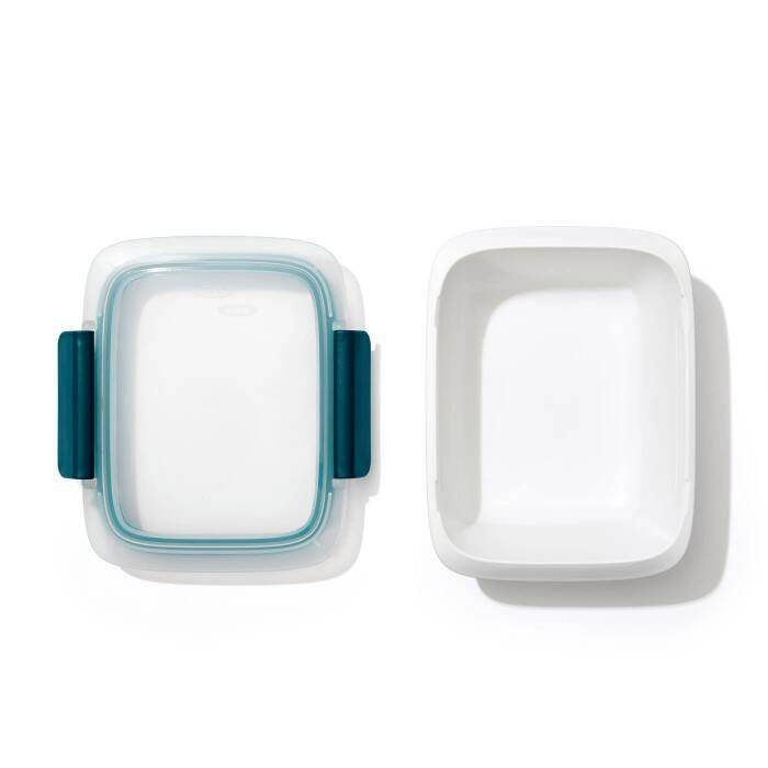 Pojemnik Prep And Go z kolekcji Good Grips marki OXO, - umożliwia jedzenie domowych, zdrowych posiłków w każdym miejscu, - świetnie sprawdzi się do dań makaronowych lub z ryżem, - jedzenie zachowuje świeżość dzięki szczelnemu zamknięciu, - pojemnik pomieści do 800 ml, - jest w kolorze biało-morskim.