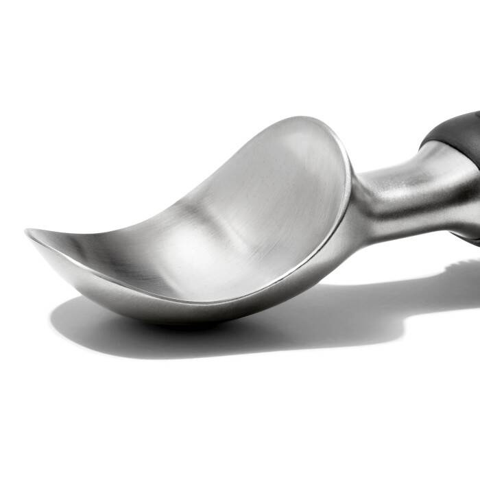 Łyżka do lodów z kolekcji Good Grips marki OXO, - wykonana ze stali nierdzewnej, - czarny uchwyt zapewnia wygodne nakładanie, - spiczasta końcówka doskonale radzi sobie nawet z najtwardszymi lodami, - płaskie krawędzie sięgają do najgłębszych rogów pudełek z lodami, - łyżka nadaje się do mycia w zmywarce.