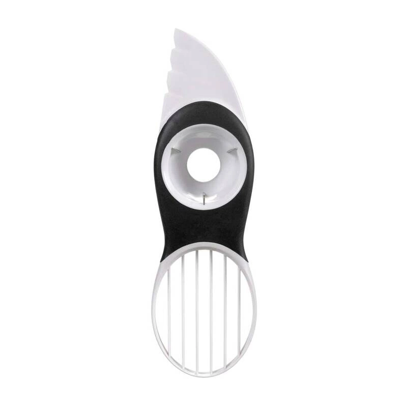 Narzędzie do awokado, biały, Oxo: - narzędzie 3w1: nóż do zdejmowania skórki, usuwania pestki oraz krojenia miąższu, - wykonany w całości z tworzywa sztucznego, - bezpieczny w użytkowaniu, - nadaje się do mycia w zmywarce. Wymiary: ok. 27 × 12 cm Materiał: tworzywo sztuczne Kolor: czarny, biały