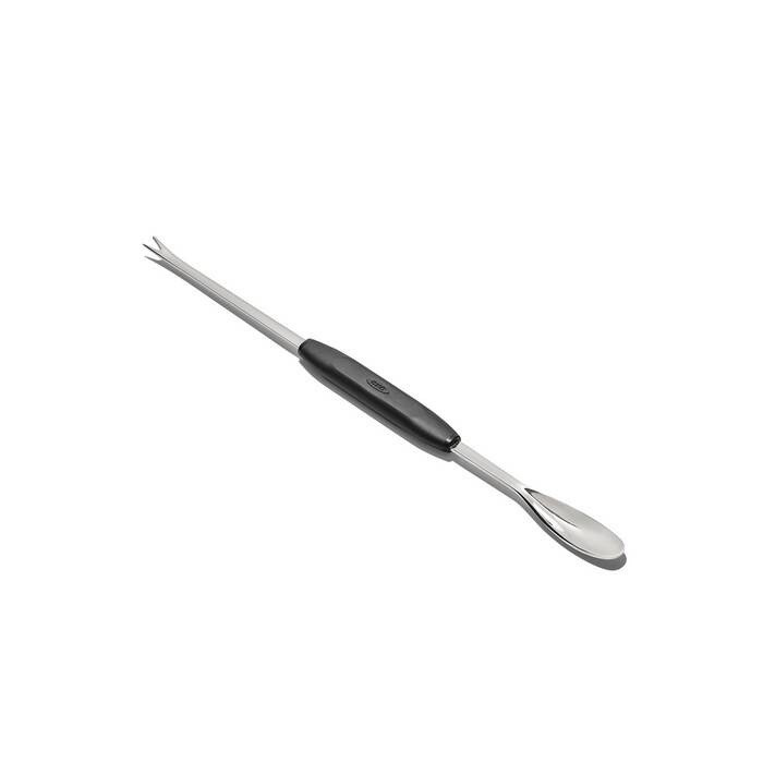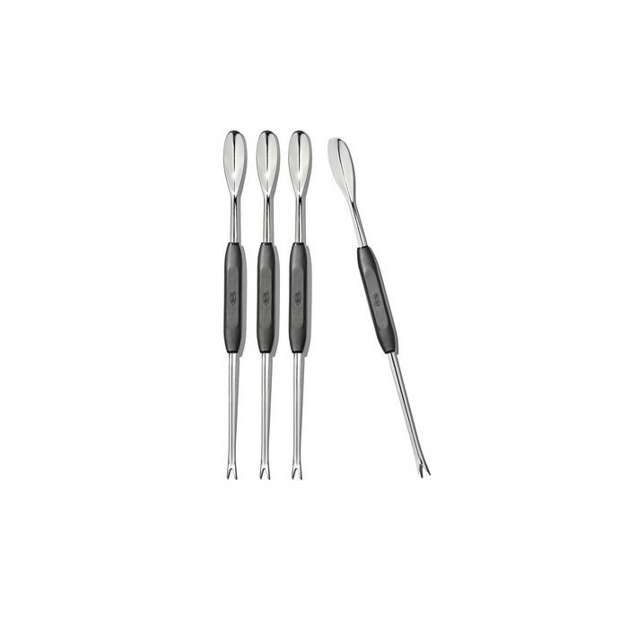 Narzędzia do owoców morza Oxo: - w komplecie 4 szt., - są wykonane ze stali nierdzewnej i mają antypoślizgowe elementy, - z jednej strony znajdują się łyżeczki, a z drugiej widelczyki - ułatwiają spożywanie owoców morza.