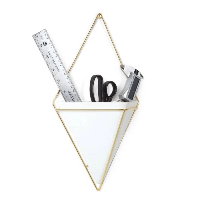 - duży pojemnik na przybory biurowe lub inne, można goużywać jako doniczki na małe rośliny, - wykonany z ceramiki i metalumalowanego na złoto, - geometryczny kształt, - zestaw montażowy wkomplecie, - w pudełku kartonowym. Wymiary: 22,2 x 9,5 x 38,7 cm Kolor: biały, złoty Materiał: ceramika, metal Kolekcja: Trigg