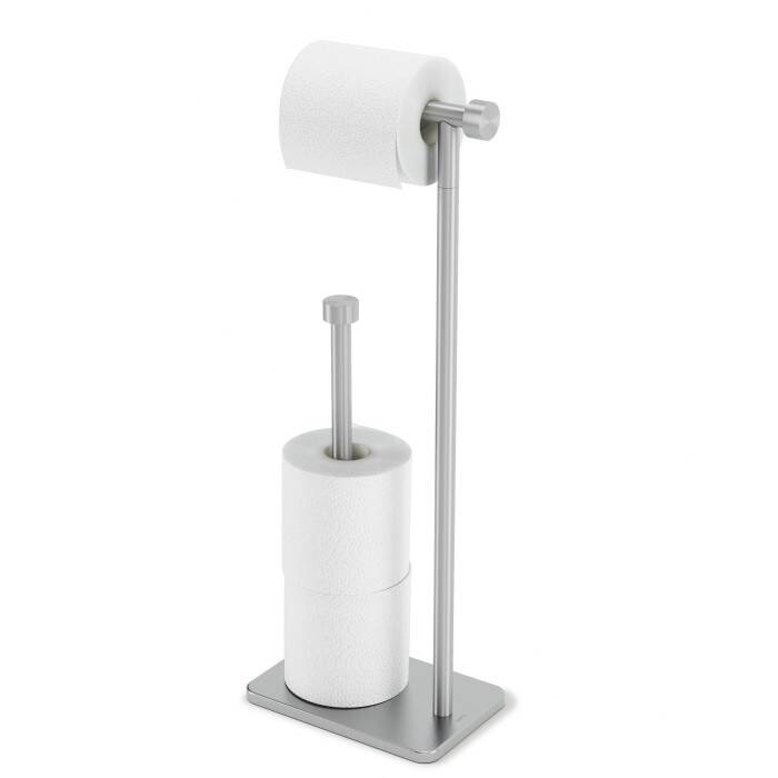 - stojak z uchwytem i zasobnikiem na papier toaletowy (pojemność 3 rolki), - wykonany z metalu, - nie zajmuje wiele miejsca, - waga: ok. 1,39 kg. Wymiary: 9 x 11 x 25 cm (gł. x szer. x wys.) Materiał: metal Kolor: srebrny