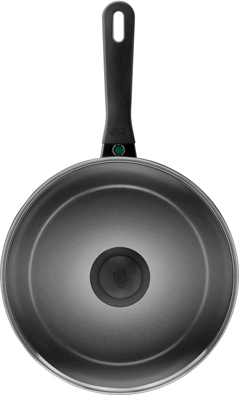 Patelnia saute może zrobić więcej niż tylko fantastycznie wyglądać. Jej funkcje najwyższej jakości sprawiają, że gotowanie będzie dla Ciebie niezwykle proste. Błyszcząca, czarna powłoka nieprzywierająca KERA GLOSS zapewnia, że Twoje dania mięsne i warzywne są chrupiąco złociste. Aby upewnić się, że są one równomiernie gotowane na całej powierzchni, naczynie kuchenne posiada innowacyjną technologię dna Radiant Induction. Przewodzi ona ciepło z płyty grzejnej do patelni szybko i równomiernie. Działa na wszystkich rodzajach płyt grzejnych, ale najlepiej sprawdzi się na kuchenkach indukcyjnych. Ponadto w uchwycie patelni znajduje się wskaźnik ciepła THERMOPOINT. Staje się on czerwony, gdy patelnia jest gorąca, dzięki czemu łatwo znajdziesz idealną temperaturę gotowania. Dzięki dokładnie przylegającej pokrywce ciepło zawsze pozostaje w patelni, dzięki czemu zużywasz mniej energii podczas smażenia.