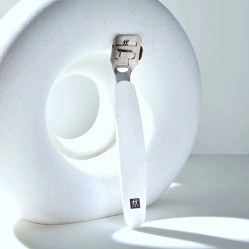 Ścinak do pięt Zwilling z wymiennymi ostrzami jest szczególnie skuteczny w usuwaniu mocnych odcisków. Ostrze jest ostre z obu stron i zamocowane na uchwycie za pomocą mechanizmu przesuwnego. Wykonany jest z ergonomicznie ukształtowanego, wytrzymałego plastikowego uchwytu z wbudowaną szczoteczką do czyszczenia i doskonale leży w dłoni dzięki swojej długości wynoszącej 15 cm. Uchwyt ostrza wykonany jest z wytrzymałej, nierdzewnej stali. W zestawie dostarczane jest 10 wymiennych ostrzy, co zapewnia długotrwałą i skuteczną pielęgnację stóp.