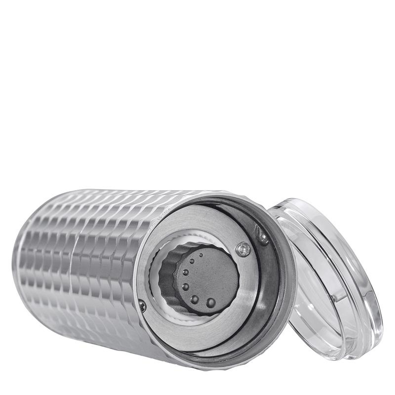 Aluminiowy młynek do przypraw z ceramicznym mechanizmem mielącym.