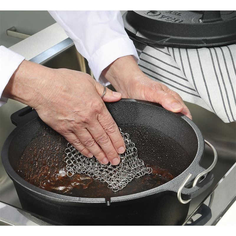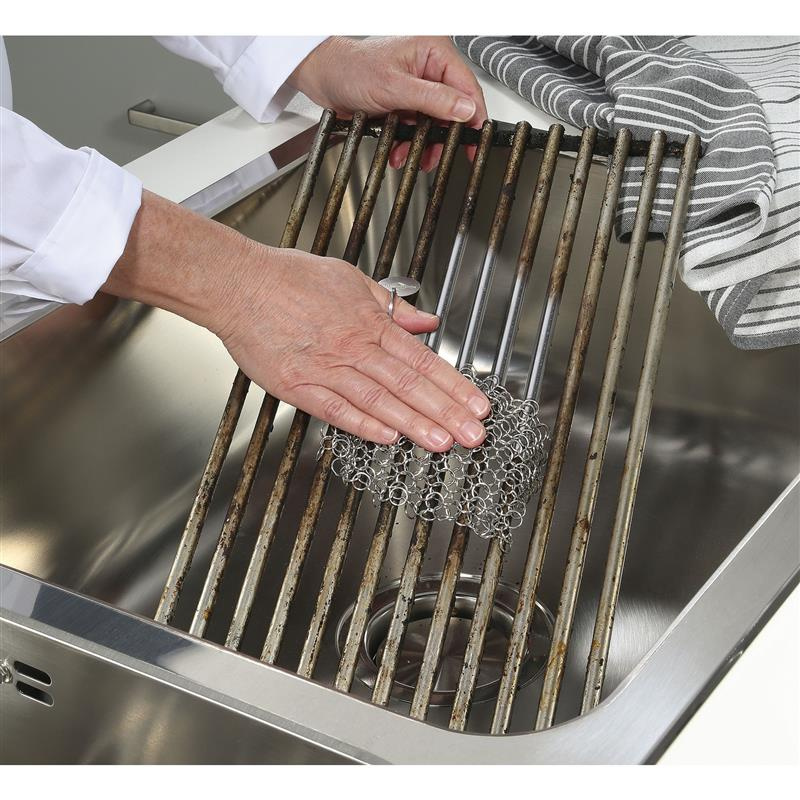 * myjka ze stalowej siatki do usuwania upartych zabrudzeń z wytrzymałych powierzchni, takich jak ruszty grillowe, żelazne patelnie czy naczynia kuchenne z nieemaliowanego żeliwa