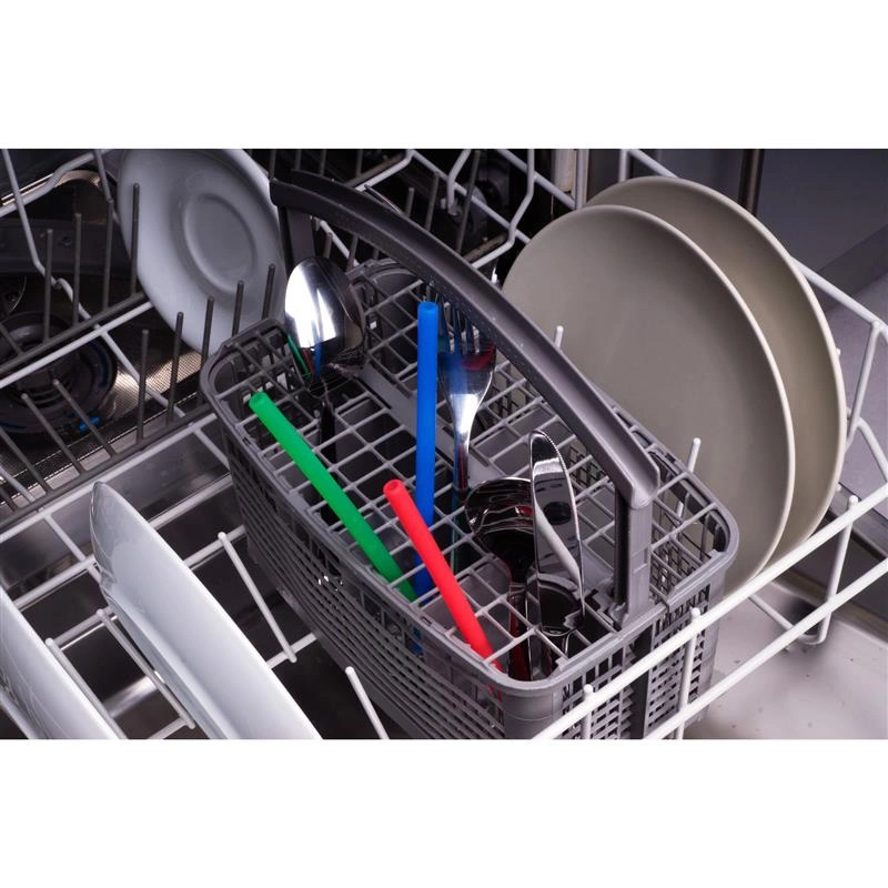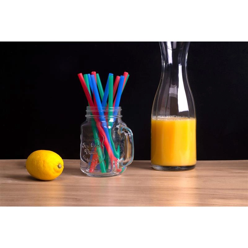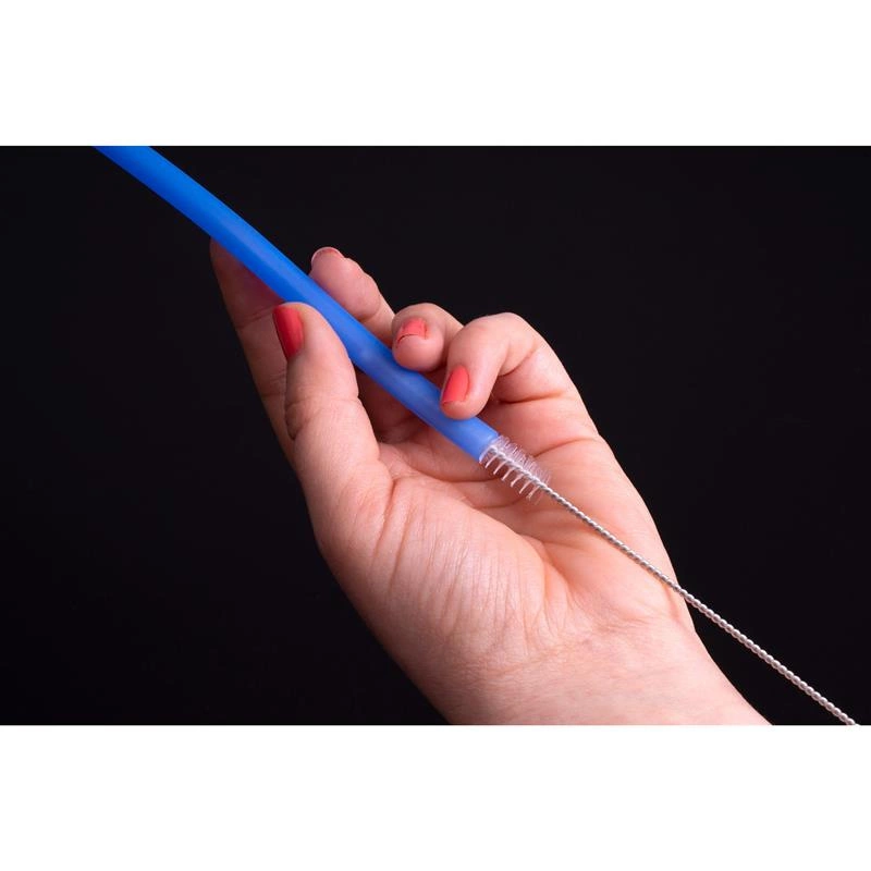 Zestaw sześciu silikonowych słomek do napojów ze szczoteczką do czyszczenia.