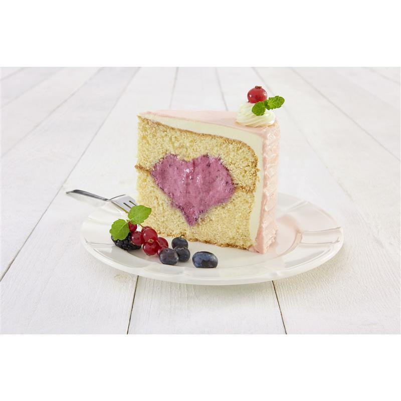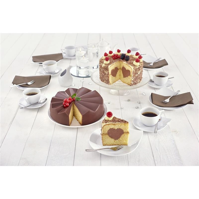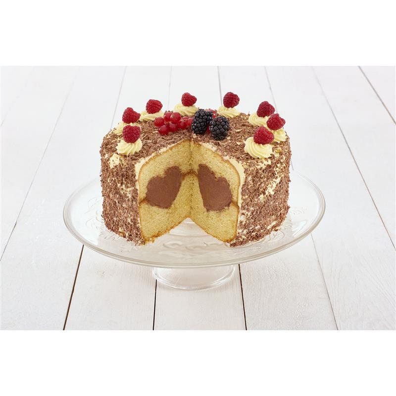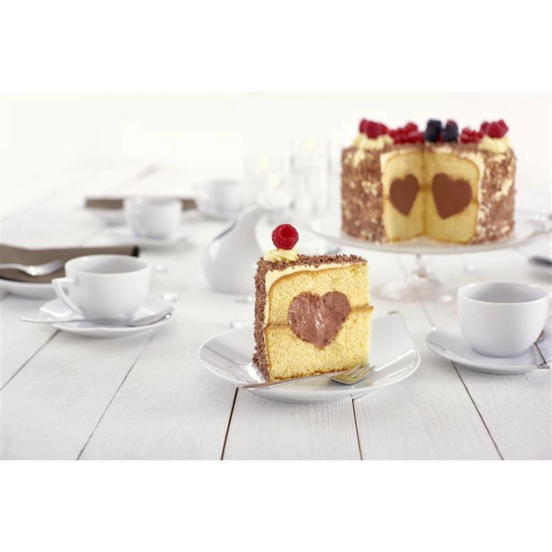 * podwójna forma posłuży do upieczenia dwóch połówek tortu, pomiędzy którymi znajdzie się przestrzeń w kształcie serca - będzie mogła zostać wypełniona kremem aby kawałki tortu niezwykle się prezentowały