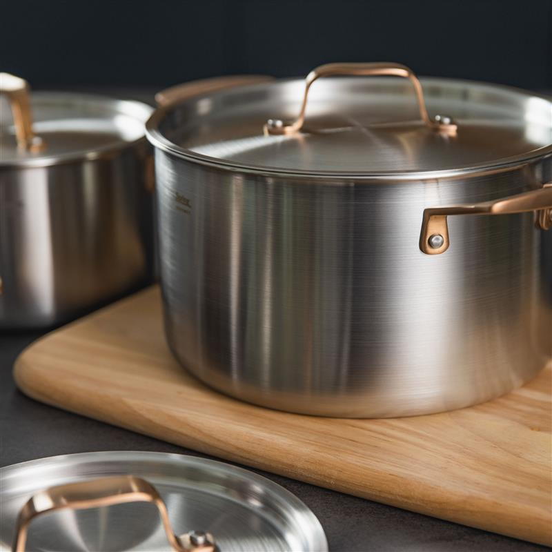 * rączki w kolorze różowego złota nadają garnkom elegancki, modny wygląd
