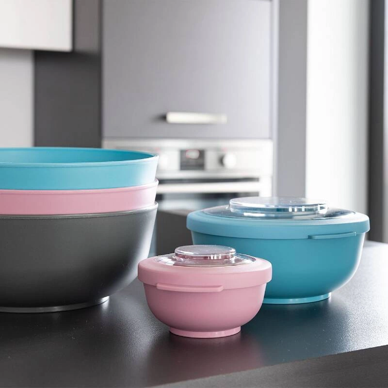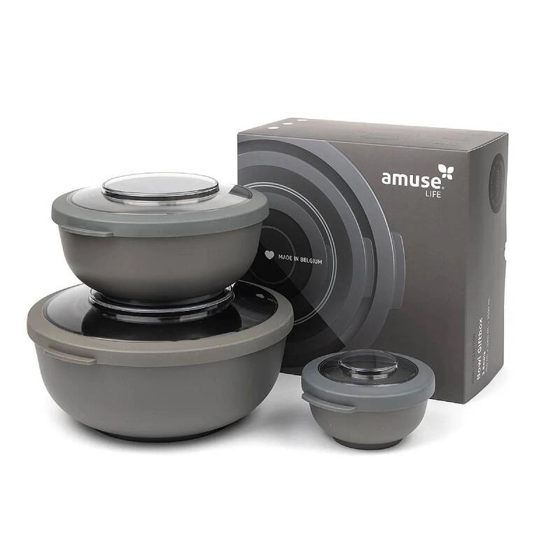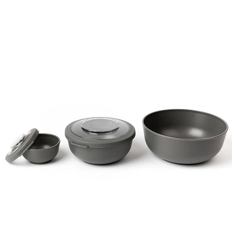 Miski kuchenne z pokrywkami z przezroczystymi wieczkami umożliwiają sprawdzenie ich zawartości bez otwierania. Pokrywki pełnią rolę podstawek. Można myć w zmywarce i używać w mikrofalówce (bez pokrywki) lub używać w zamrażarce. Nadają się do recyklingu. Certyfikat BRC (do kontaktu z żywnością). Produkcja w Belgii z tworzywa BPA free. Odporność temper. -30°C do + 100°C. Poj: 2L, 1L, 0,2L. Wymiary misek: 21.6 x 10.6 cm, 17.3 x 8.9 cm, 10.5 x 6.4 cm