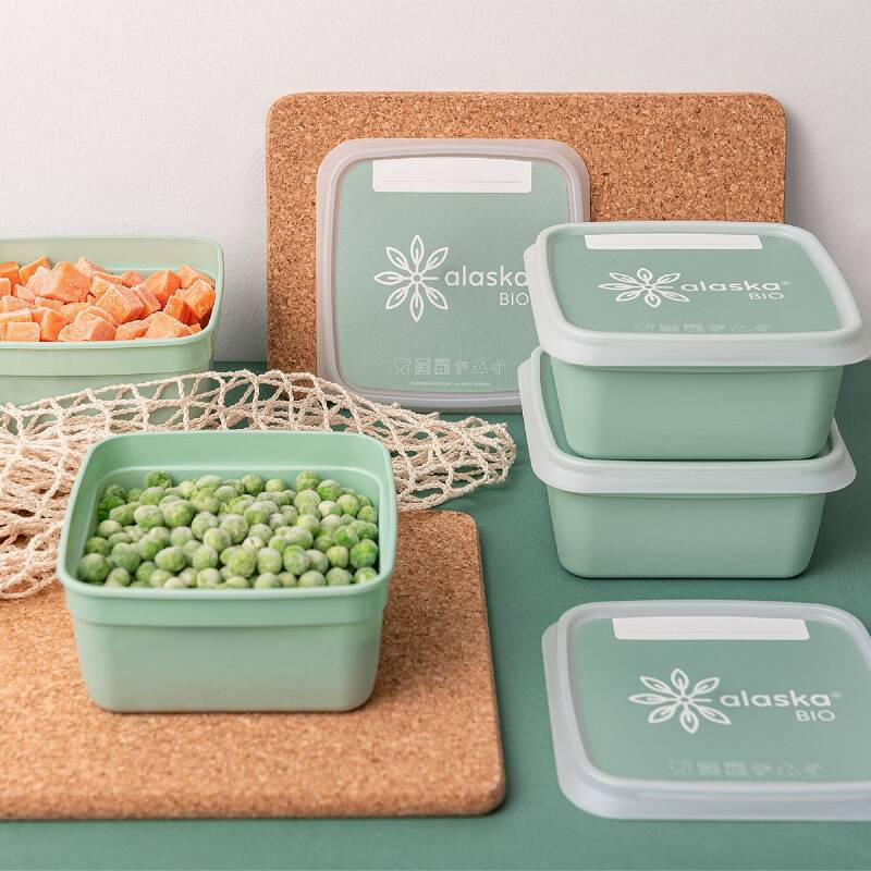 Eko pojemniki do zamrażarki z serii Alaska BIO w 70% z trzciny cukrowej. Pokrywki z miejscem do zapisania daty. Do użytku w zakresie -30°C do +100°C. Można myć w zmywarce. Nadają się do recyklingu. Certyfikat BRC (do kontaktu z żywnością). Wyprodukowano w Belgii. Nie używać w mikrofalówce. Poj.: 3 x 1L (1000ml). Wymiary: 17 x 12,8 x 8,9 cm