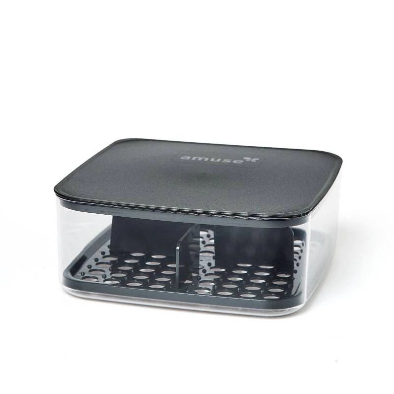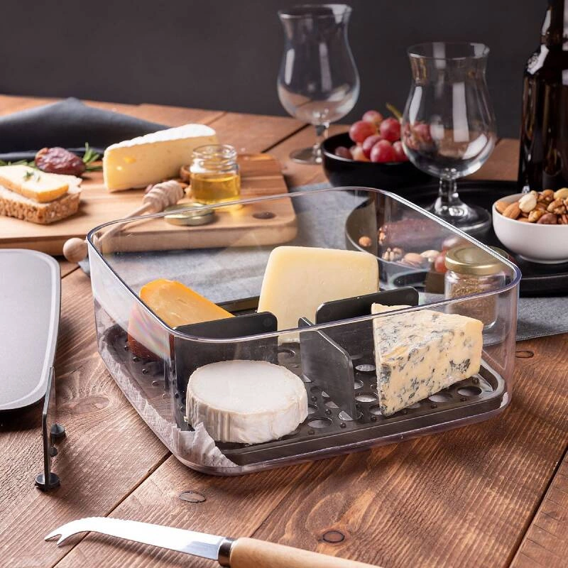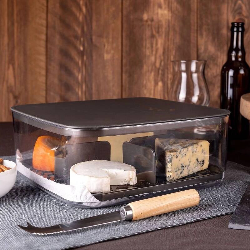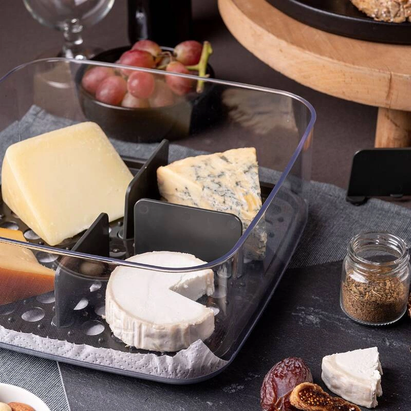 Pojemnik do serów z przegródkami powstał we współpracy z belgijskim mistrzem serowarstwa Van'em Tricht. Składa się z pojemnika, tacy z otworami, 4 ruchomych przegródek i pokrywki. Do przechowywania serów w lodówce oraz ich serwowania. Specjalne dno ma wpływ na świeżość serów. Producent zaleca wyłożenie dna pojemnika kawałkiem papierowego ręcznika w celu polepszenia wchłaniania wilgoci. Można myć w zmywarce i używać w zamrażarce. Nie wolno używać w mikrofalówce. Odporny od -30°C do +100°C. Certyfikat BRC (do kontaktu z żywnością). BPA free. Wymiary: 24.1 x 24.1 x 9.6 cm