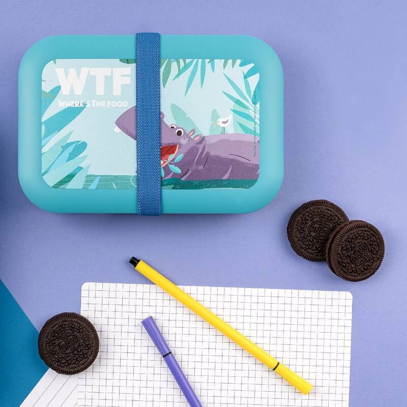 Lunchbox do szkoły z grafiką hipopotama "Where's the food" posiada wygodne otwieranie i zamykanie. Gumka gwarantuje transport jedzenia bez ryzyka otwarcia. Można myć w zmywarce. Nadaje się do recyklingu. Certyfikat do kontaktu z żywnością. Europejska produkcja z tworzywa bez BPA. Odporny na temperaturę od -30°C do +100°C. Wymiary: 21 x 14 x 5 cm