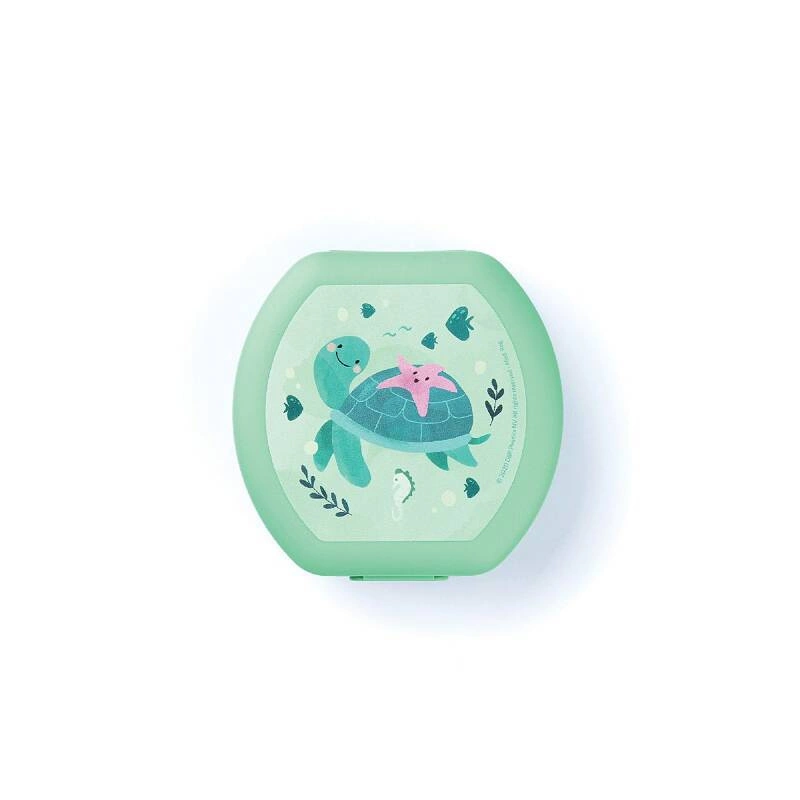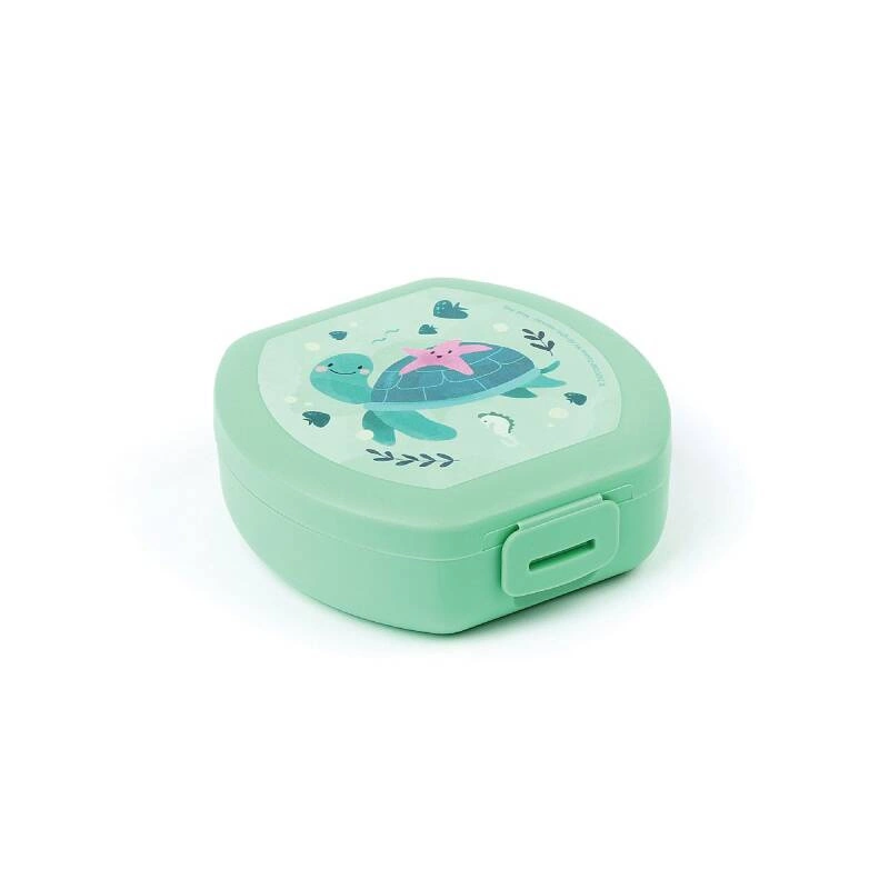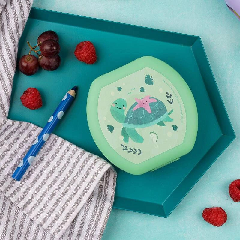 Pojemnik na przekąskę do szkoły z grafiką żółwika i z wygodnym otwieraniem za pomocą klipsa. Można myć w zmywarce. Nadaje się do recyklingu. Certyfikat do kontaktu z żywnością. Europejska produkcja z tworzywa bez BPA. Odporny na temperaturę od -30°C do +100°C. Wymiary: 11.2 x 11 x 4 cm.